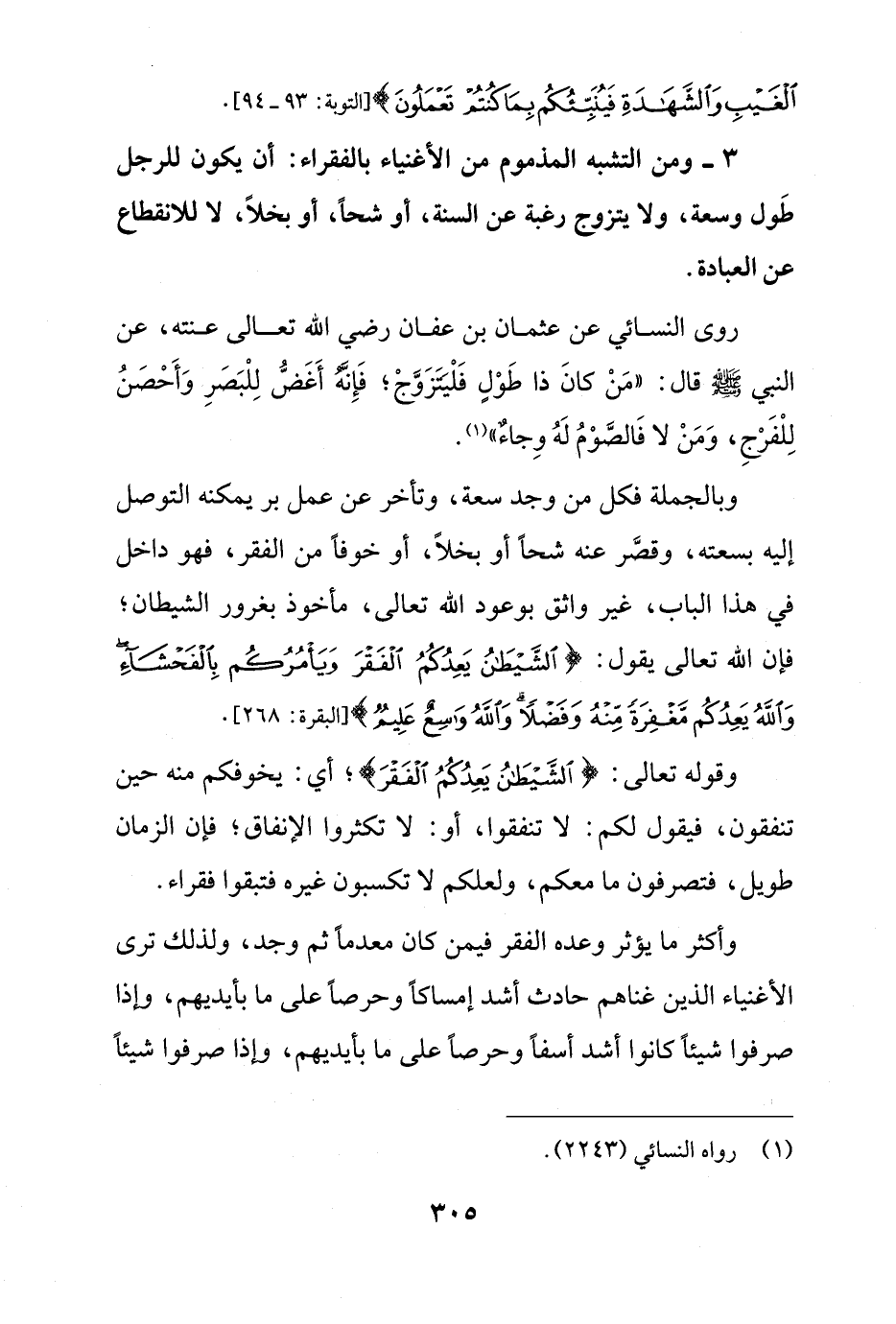 3 - ومن التشبه المذموم من الأغنياء بالفقراء: أن يكون للرجل طَول وسعة، ولا يتزوج رغبة عن السنة، أو شحاً، أو بخلاً، لا للانقطاع عن العبادة.