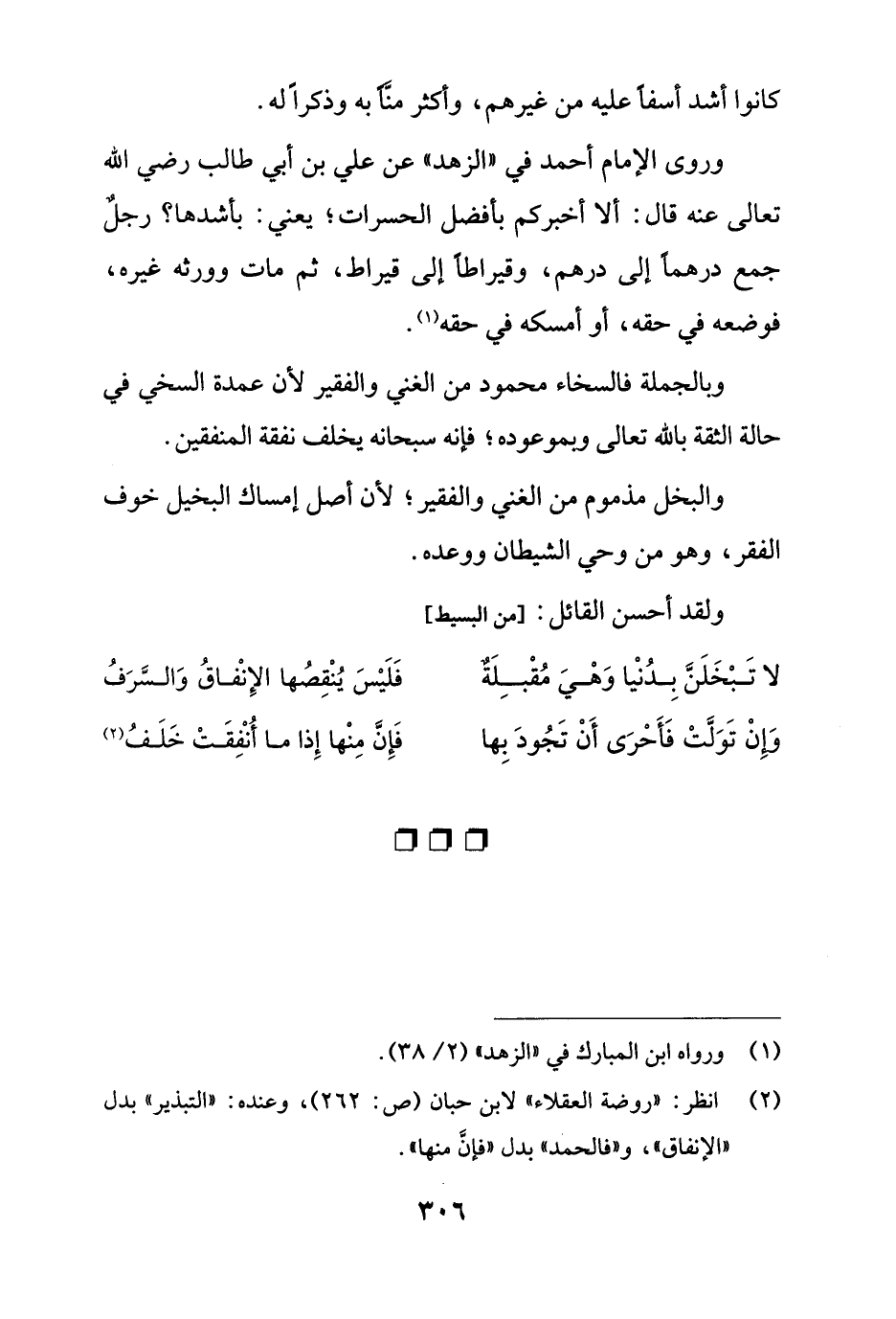 (¬2) انظر: "روضة العقلاء" لابن حبان (ص: 262)، وعنده: "التبذير" بدل "الإنفاق"، و "فالحمد" بدل "فإنَّ منها".