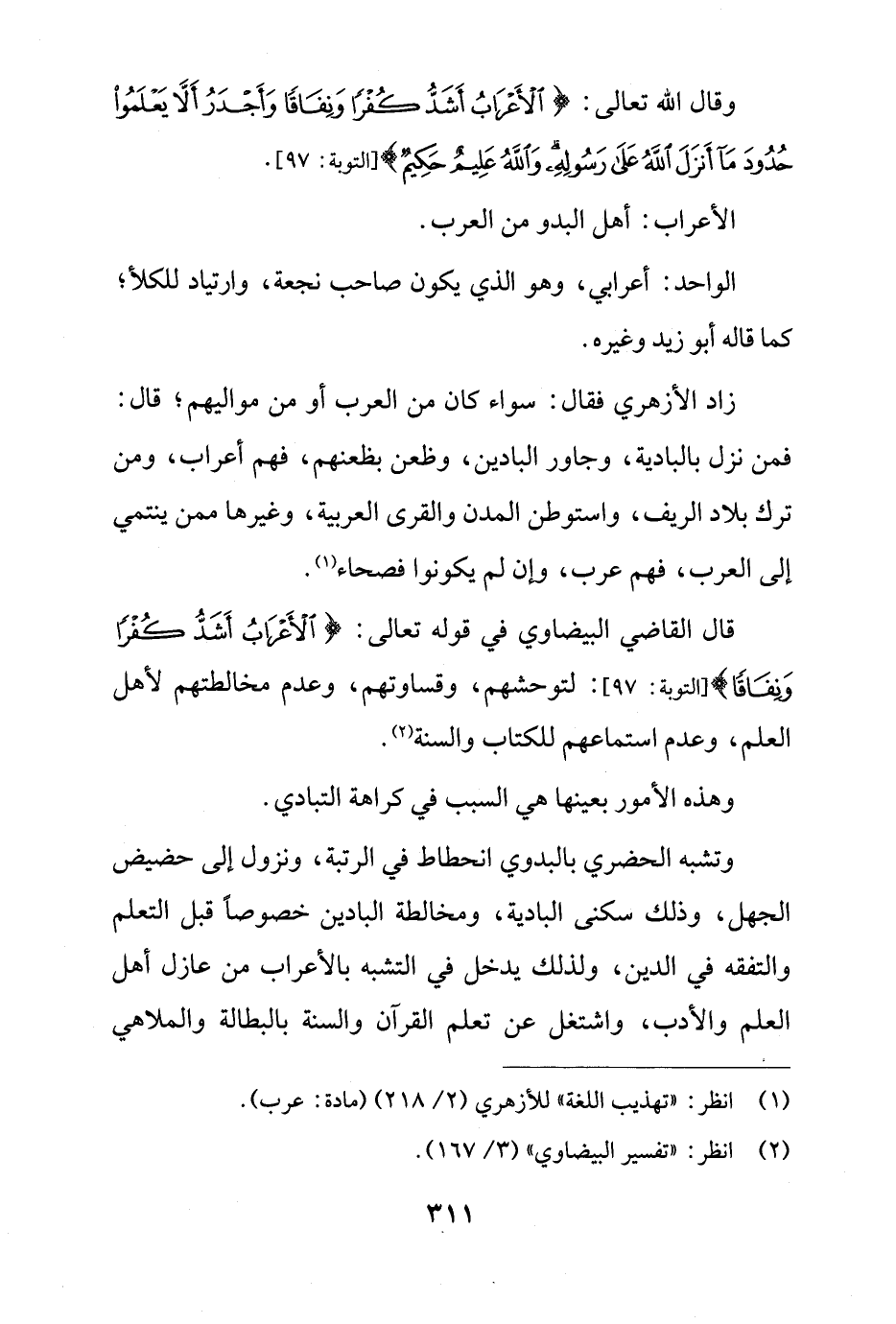 قال القاضي البيضاوي في قوله تعالى: {الْأَعْرَابُ أَشَدُّ كُفْرًا وَنِفَاقًا} [التوبة: 97]: لتوحشهم، وقساوتهم، وعدم مخالطتهم لأهل العلم، وعدم استماعهم للكتاب والسنة (¬2).
