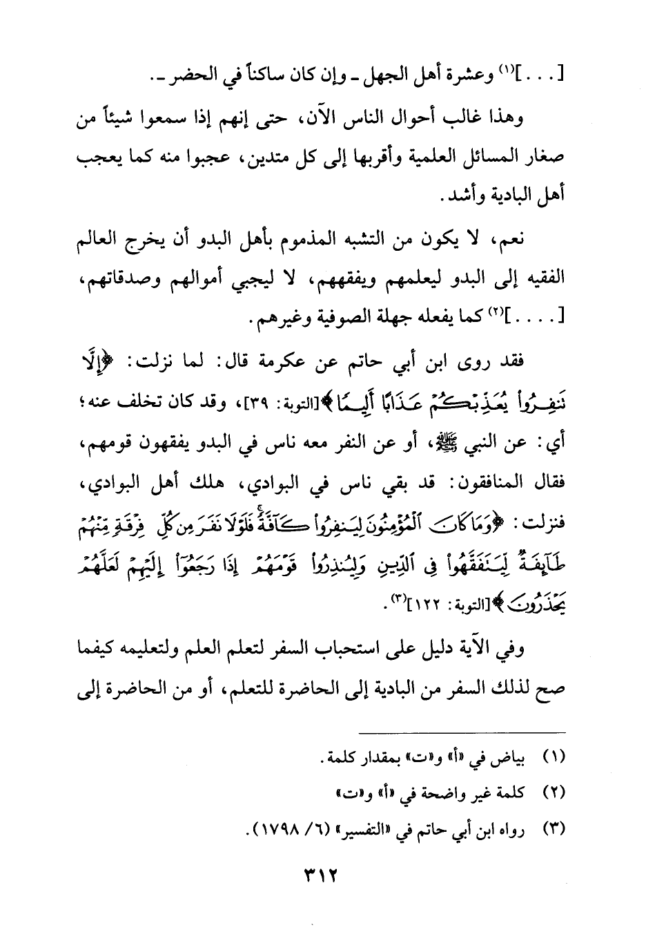 نعم، لا يكون من التشبه المذموم بأهل البدو أن يخرج العالم الفقيه إلى البدو ليعلمهم ويفقههم، لا ليجبي أموالهم وصدقاتهم، [ ... ] (¬2) كما يفعله جهلة الصوفية وغيرهم.