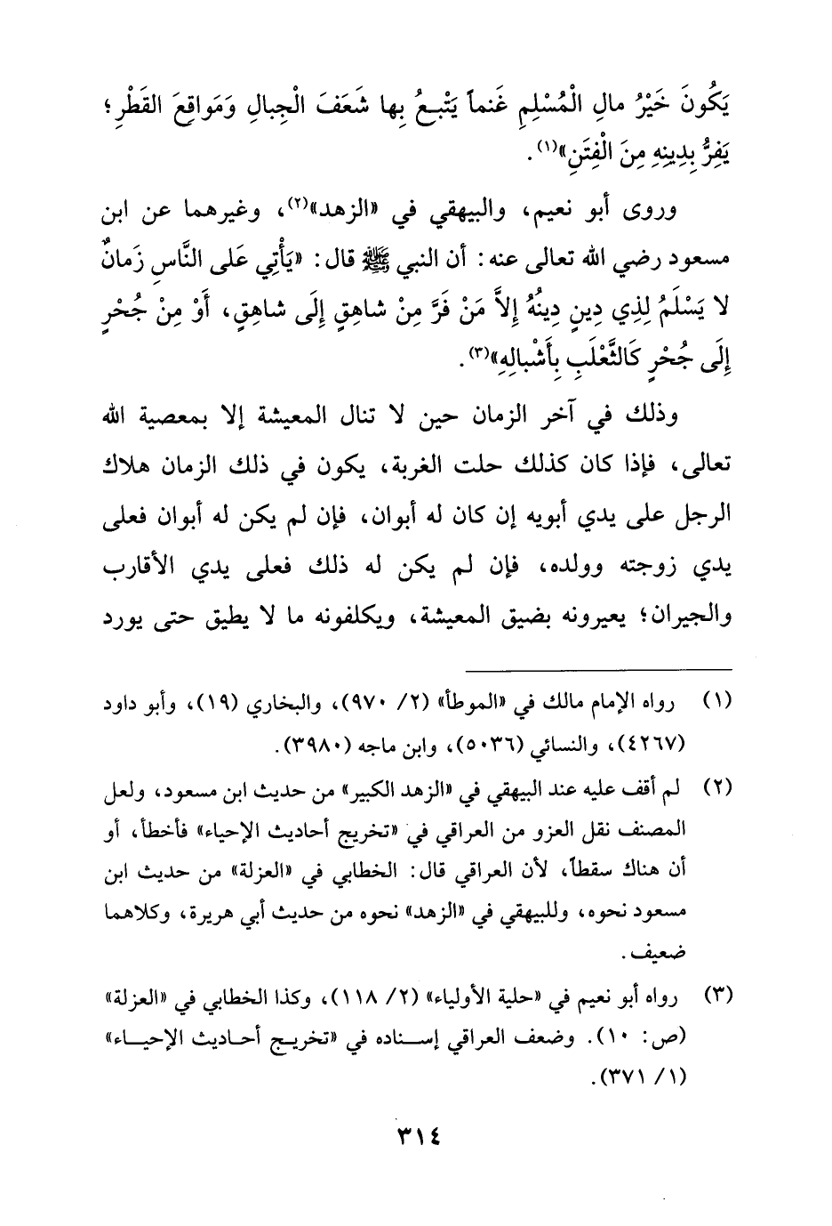 وروى أبو نعيم، والبيهقي في "الزهد" (¬2)، وغيرهما عن ابن مسعود رضي الله تعالى عنه: أن النبي - صلى الله عليه وسلم - قال: "يَأْتِي عَلى النَّاسِ زَمانٌ لا يَسْلَمُ لِذِي دِينٍ دِينُهُ إِلَّا مَنْ فَرَّ مِنْ شاهِقٍ إِلَى شاهِقٍ، أَوْ مِنْ جُحْرٍ إِلَى جُحْرٍ كَالثَّعْلَبِ بِأَشْبالِهِ" (¬3).