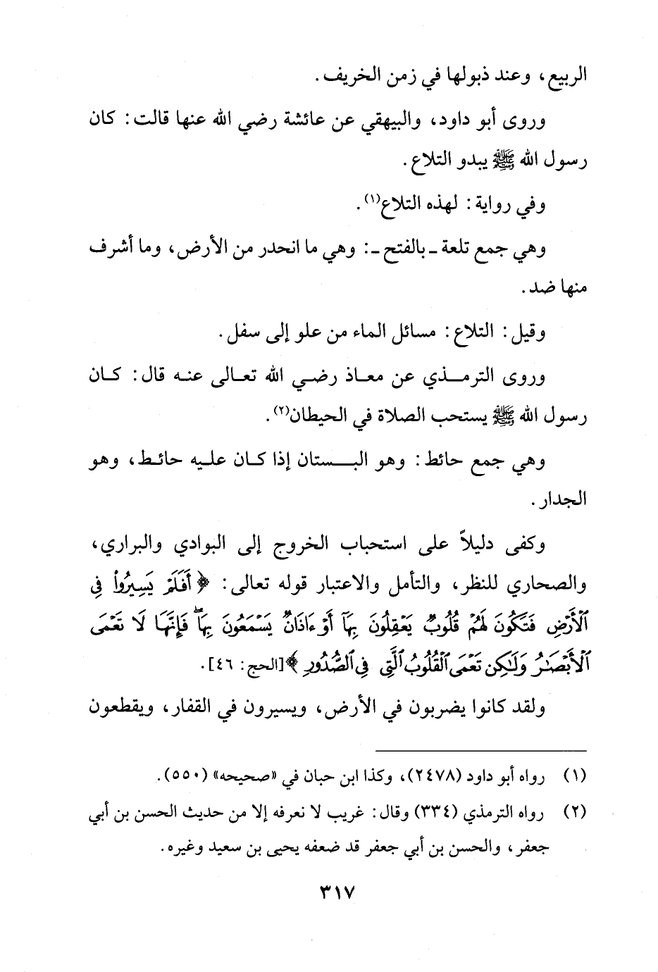 وكفى دليلاً على استحباب الخروج إلى البوادي والبراري، والصحاري للنظر، والتأمل والاعتبار قوله تعالى: {أَفَلَمْ يَسِيرُوا فِي الْأَرْضِ فَتَكُونَ لَهُمْ قُلُوبٌ يَعْقِلُونَ بِهَا أَوْ آذَانٌ يَسْمَعُونَ بِهَا فَإِنَّهَا لَا تَعْمَى الْأَبْصَارُ وَلَكِنْ تَعْمَى الْقُلُوبُ الَّتِي فِي الصُّدُورِ} [الحج: 46].