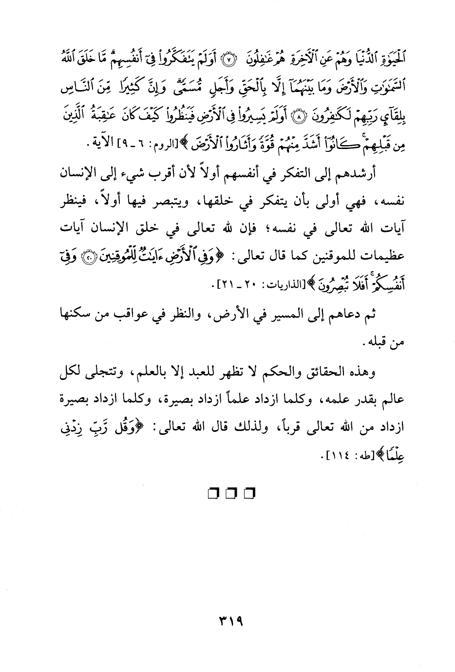 الْحَيَاةِ الدُّنْيَا وَهُمْ عَنِ الْآخِرَةِ هُمْ غَافِلُونَ (7) أَوَلَمْ يَتَفَكَّرُوا فِي أَنْفُسِهِمْ مَا خَلَقَ اللَّهُ السَّمَاوَاتِ وَالْأَرْضَ وَمَا بَيْنَهُمَا إِلَّا بِالْحَقِّ وَأَجَلٍ مُسَمًّى وَإِنَّ كَثِيرًا مِنَ النَّاسِ بِلِقَاءِ رَبِّهِمْ لَكَافِرُونَ (8) أَوَلَمْ يَسِيرُوا فِي الْأَرْضِ فَيَنْظُرُوا كَيْفَ كَانَ عَاقِبَةُ الَّذِينَ مِنْ قَبْلِهِمْ كَانُوا أَشَدَّ مِنْهُمْ قُوَّةً وَأَثَارُوا الْأَرْضَ} [الروم: 7 - 9] الآية.