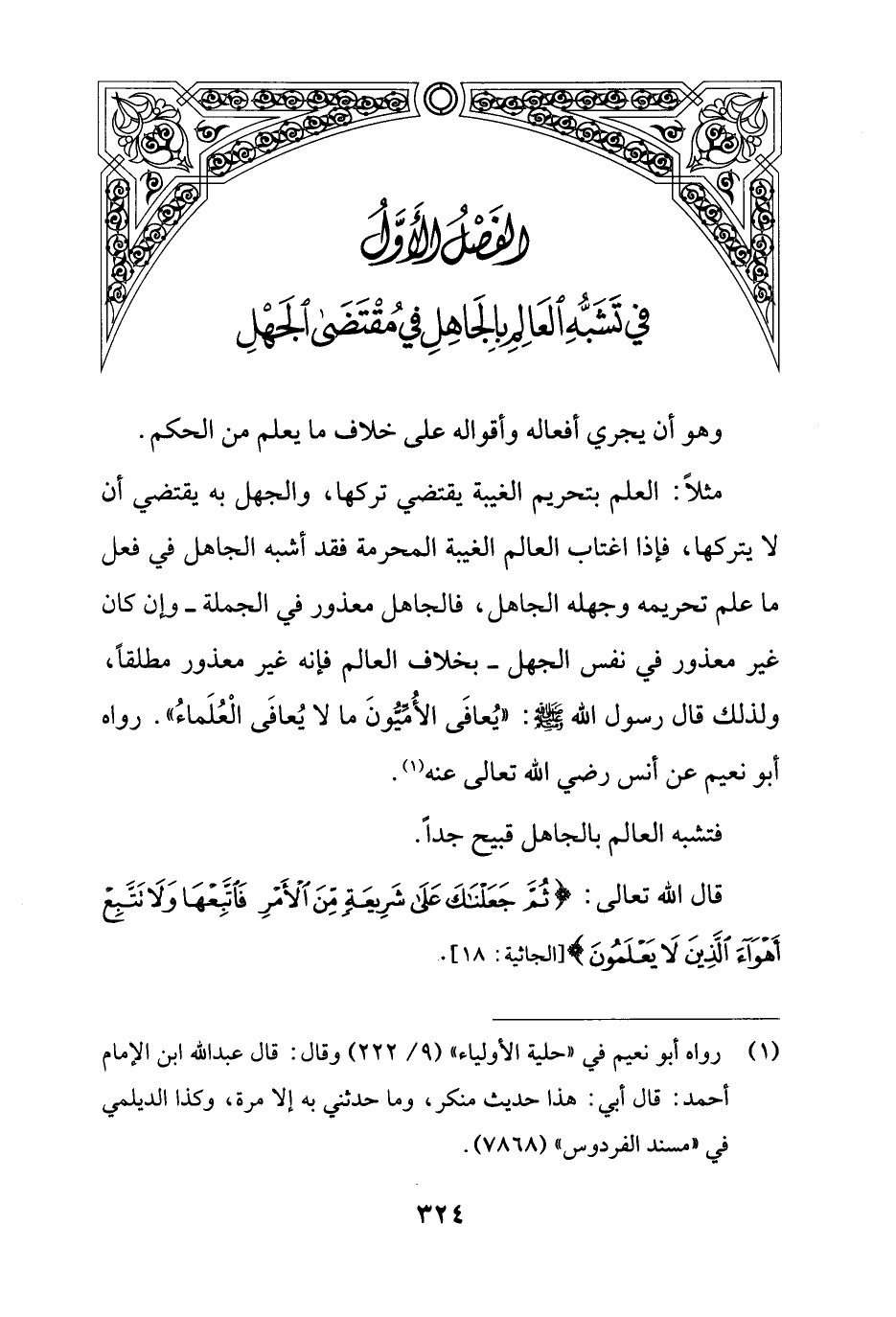 الفَصْلُ الأَوَّلُ في تَشَبُّهِ العَالِمِ باِلجَاهِلِ في مُقْتَضَى الجَهْلِ