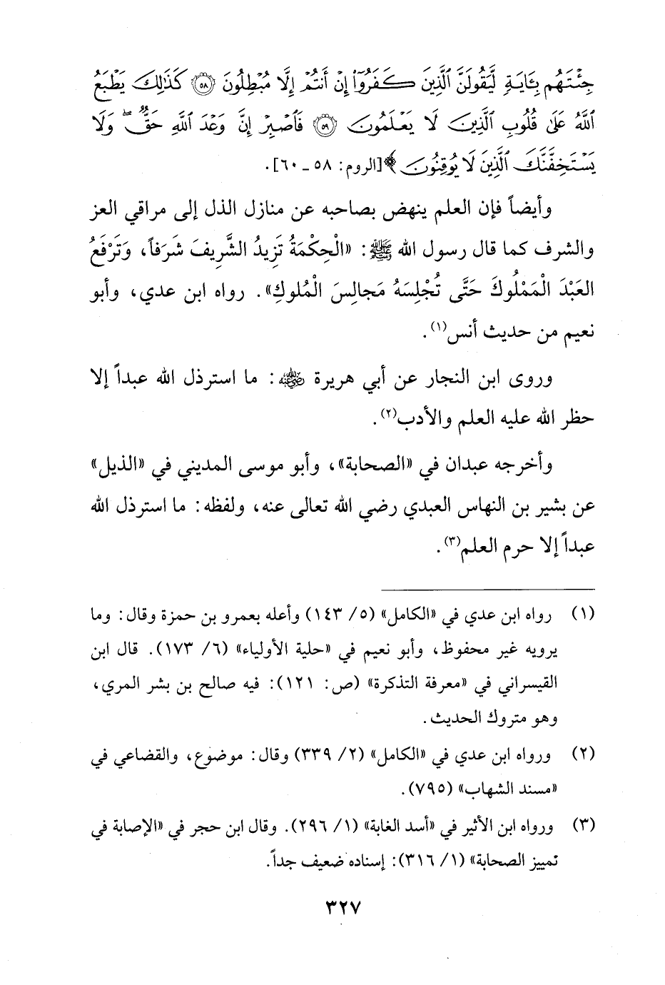 وأيضاً فإن العلم ينهض بصاحبه عن منازل الذل إلى مراقي العز والشرف كما قال رسول الله - صلى الله عليه وسلم -: "الْحِكْمَةُ تَزِيدُ الشَّرِيفَ شَرَفاً، وَتَرْفَعُ العَبْدَ الْمَمْلُوكَ حَتَّى تُجْلِسَهُ مَجالِسَ الْمُلوكِ". رواه ابن عدي، وأبو نعيم من حديث أنس (¬1).