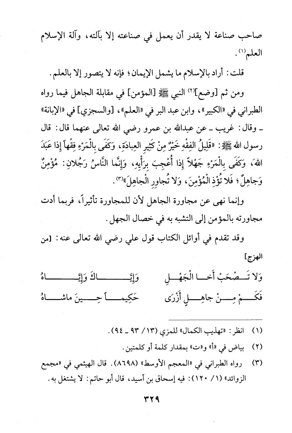 ومن ثم [وضع] (¬2) النبي -صلى الله عليه وسلم-[المؤمن] في مقابلة الجاهل فيما رواه الطبراني في "الكبير"، وابن عبد البر في "العلم"، [والسجزي] في "الإبانة" -وقال: غريب - عن عبد الله بن عمرو رضي الله تعالى عنهما قال: قال رسول الله -صلى الله عليه وسلم-: "قَلِيلُ الفِقْهِ خَيْر مِنْ كَثيرِ العِبادَةِ، وَكَفَى بِالْمَرْءِ فِقْهاً إِذا عَبَدَ اللهَ، وَكَفَى بِالْمَرْءِ جَهْلاً إِذا أُعْجِبَ بِرَأْيِهِ، وإِنَّما النَّاسُ رَجُلانِ: مُؤْمِن وَجاهِلٌ؛ فَلا تُؤْذِ الْمُؤْمِنَ، وَلا تُجاوِرِ الْجاهِلَ" (¬3).
