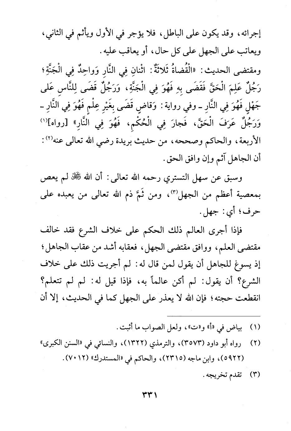 ومقتضى الحديث: "الْقُضاةُ ثَلاثَهٌ: اثْنانِ فِي النَّارِ وَواحِدٌ فِي الْجَنَّةِ؛ رَجُلٌ عَلِمَ الْحَقَّ فَقَضَى بِهِ فَهُوَ فِي الْجَنَّةِ، وَرَجُلٌ قَضَى لِلنَّاسِ عَلى جَهْلٍ فَهُوَ فِي النَّارِ - وفي رواية: وَقاضٍ قَضَى بِغَيْرِ عِلْمٍ فَهُوَ فِي النَّارِ - وَرَجُلٌ عَرَفَ الْحَقَّ، فَجارَ فِي الْحُكْمِ، فَهُوَ فِي النَّارِ" [رواه] (¬1) الأربعة، والحاكم وصححه، من حديث بريدة رضي الله تعالى عنه (¬2): أن الجاهل آثم وإن وافق الحق.