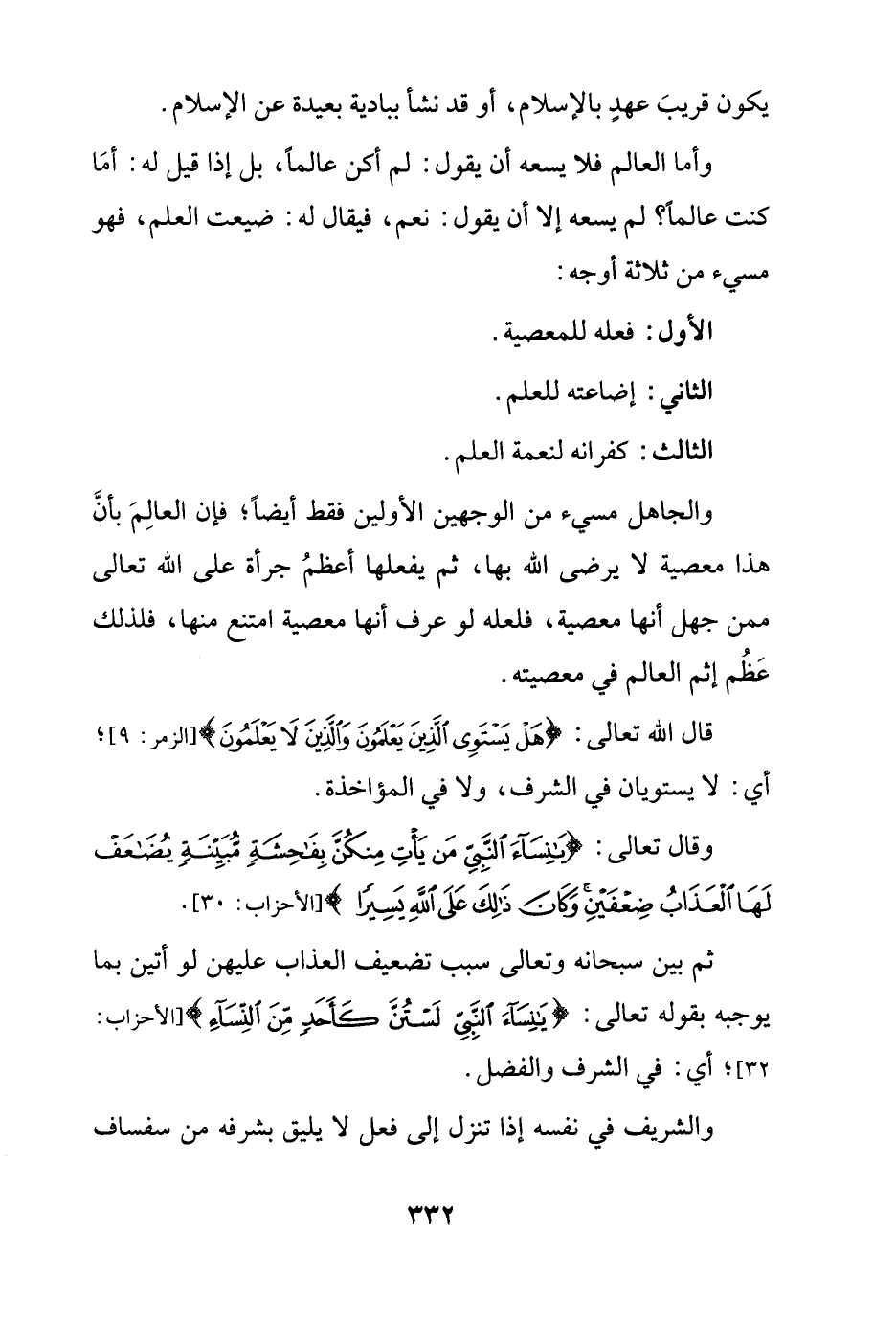 قال الله تعالى: {هَلْ يَسْتَوِي الَّذِينَ يَعْلَمُونَ وَالَّذِينَ لَا يَعْلَمُونَ} [الزمر: 9]؛ أي: لا يستويان في الشرف، ولا في المؤاخذة.
