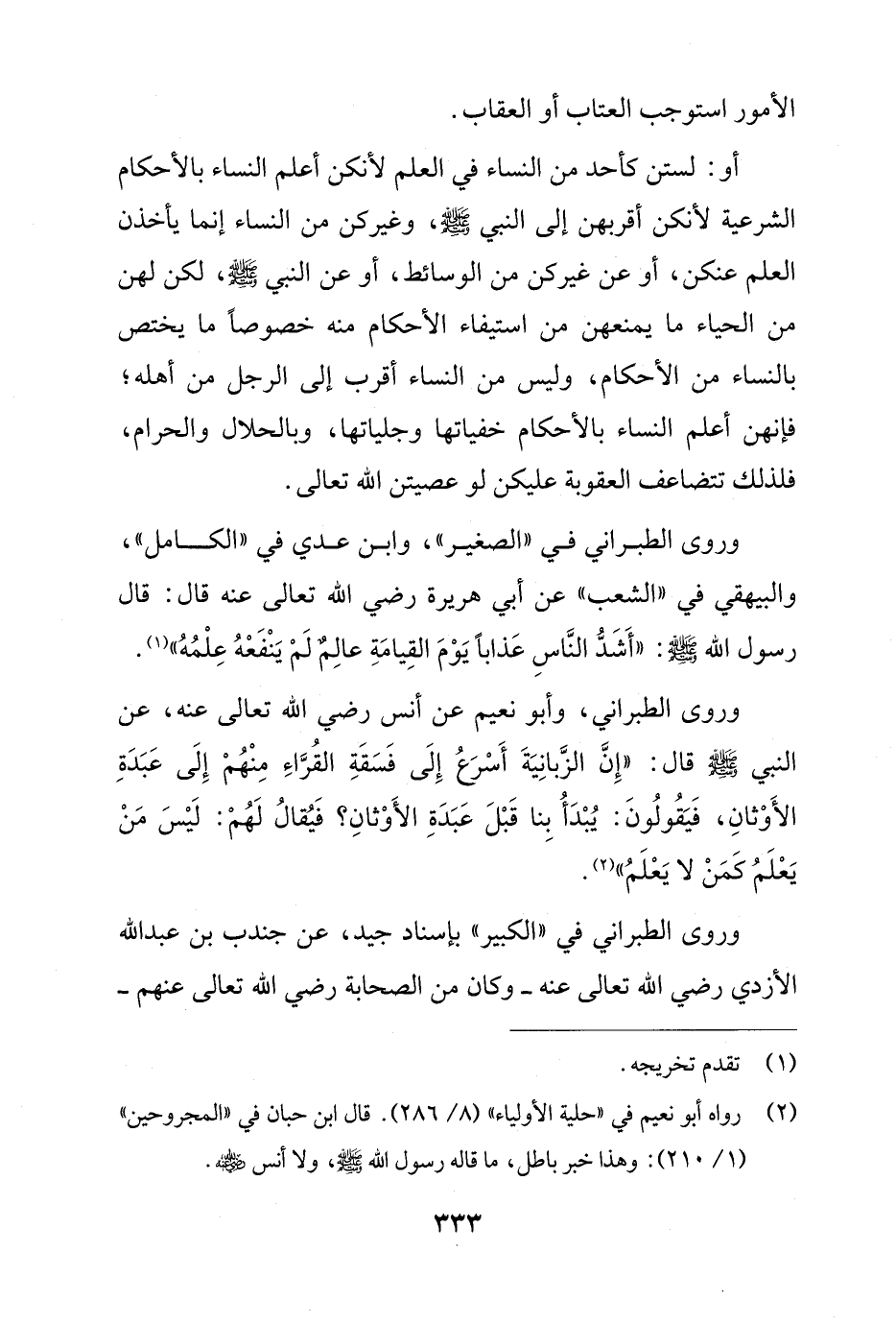 وروى الطبراني في "الصغير"، وابن عدي في "الكامل"، والبيهقي في "الشعب" عن أبي هريرة رضي الله تعالى عنه قال: قال رسول الله - الله عليه وسلم -: "أَشَدُّ النَّاسِ عَذاباً يَوْمَ القِيامَةِ عالِمٌ لَمْ يَنْفَعْهُ عِلْمُهُ" (¬1).