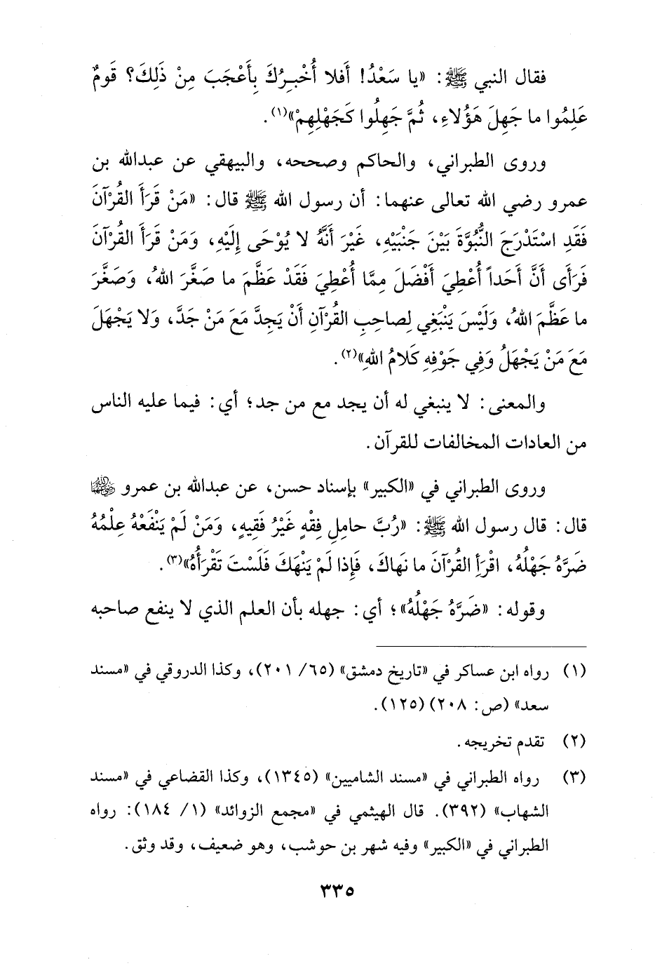 وروى الطبراني في "الكبير" بإسناد حسن، عن عبد الله بن عمرو -رضي الله عنهما- قال: قال رسول الله -صلى الله عليه وسلم-: "رُبَّ حامِلِ فِقْهٍ غَيْرُ فَقِيهٍ، وَمَنْ لَمْ يَنْفَعْهُ عِلْمُهُ ضَرَّهُ جَهْلُهُ، اقْرَأِ القُرْآنَ ما نهَاكَ، فَإِذا لَمْ يَنْهَكَ فَلَسْتَ تَقْرَأُهُ" (¬3).