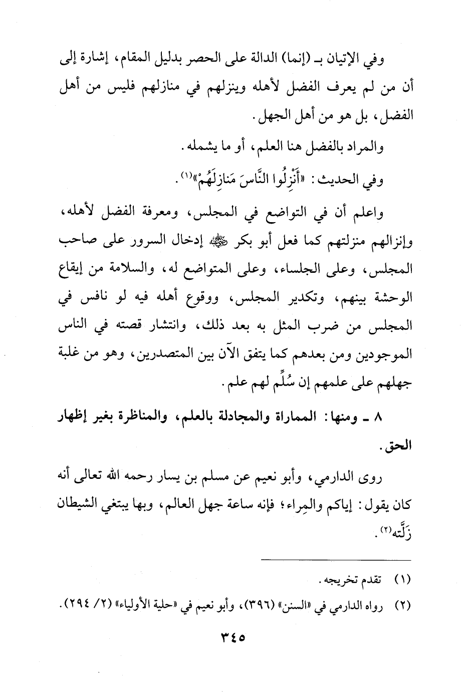 واعلم أن في التواضع في المجلس، ومعرفة الفضل لأهله، وإنزالهم منزلتهم كما فعل أبو بكر -رضي الله عنه- إدخال السرور على صاحب المجلس، وعلى الجلساء، وعلى المتواضع له، والسلامة من إيقاع الوحشة بينهم، وتكدير المجلس، ووقوع أهله فيه لو نافس في المجلس من ضرب المثل به بعد ذلك، وانتشار قصته في الناس الموجودين ومن بعدهم كما يتفق الآن بين المتصدرين، وهو من غلبة جهلهم على علمهم إن سُلِّم لهم علم.