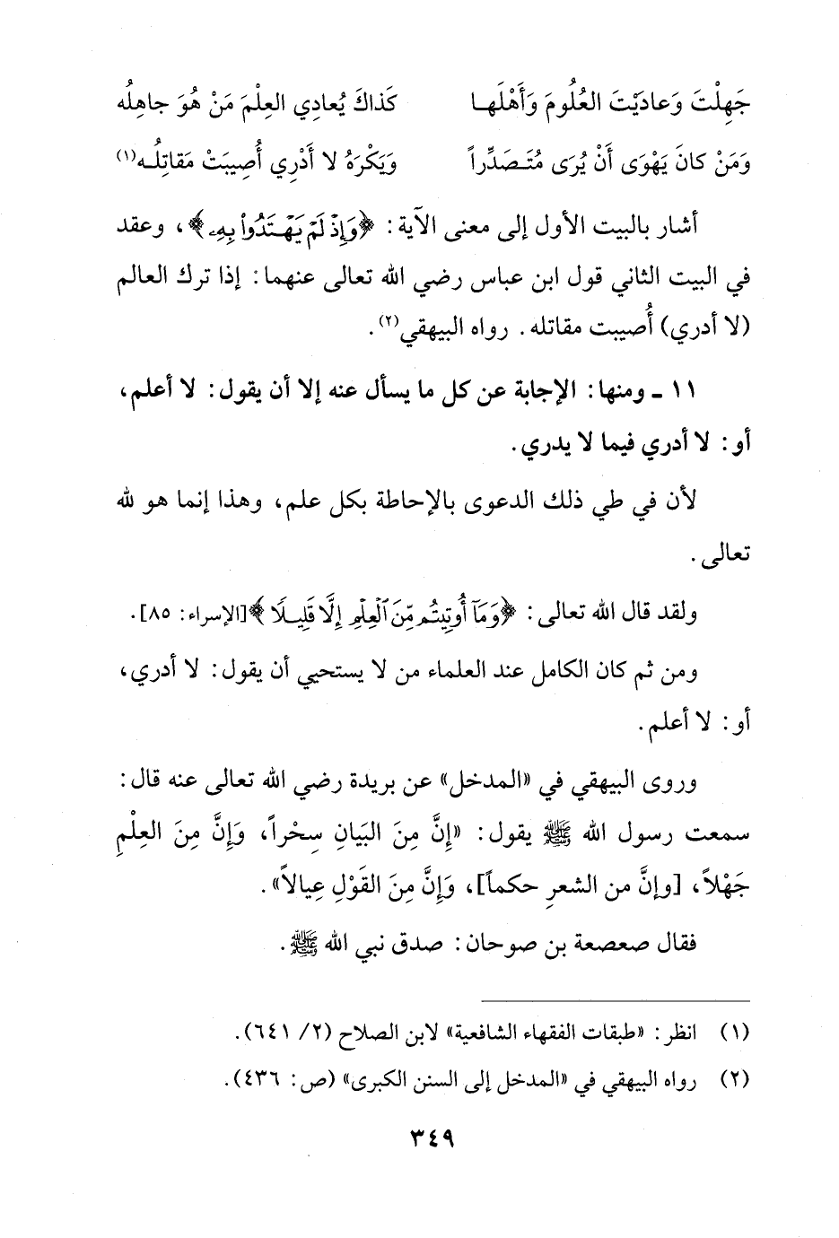 أشار بالبيت الأول إلى معنى الآية: {وَإِذْ لَمْ يَهْتَدُوا بِهِ}، وعقد في البيت الثاني قول ابن عباس رضي الله تعالى عنهما: إذا ترك العالم (لا أدري) أُصيبت مقاتله. رواه البيهقي (¬2).