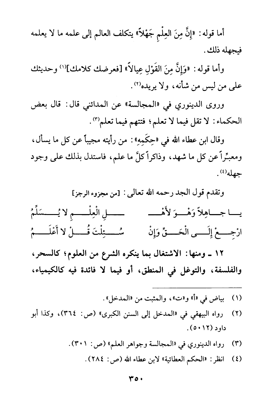 أما قوله: "إِنَّ مِنَ العِلْمِ جَهْلاً" يتكلف العالم إلى علمه ما لا يعلمه فيجهله ذلك.