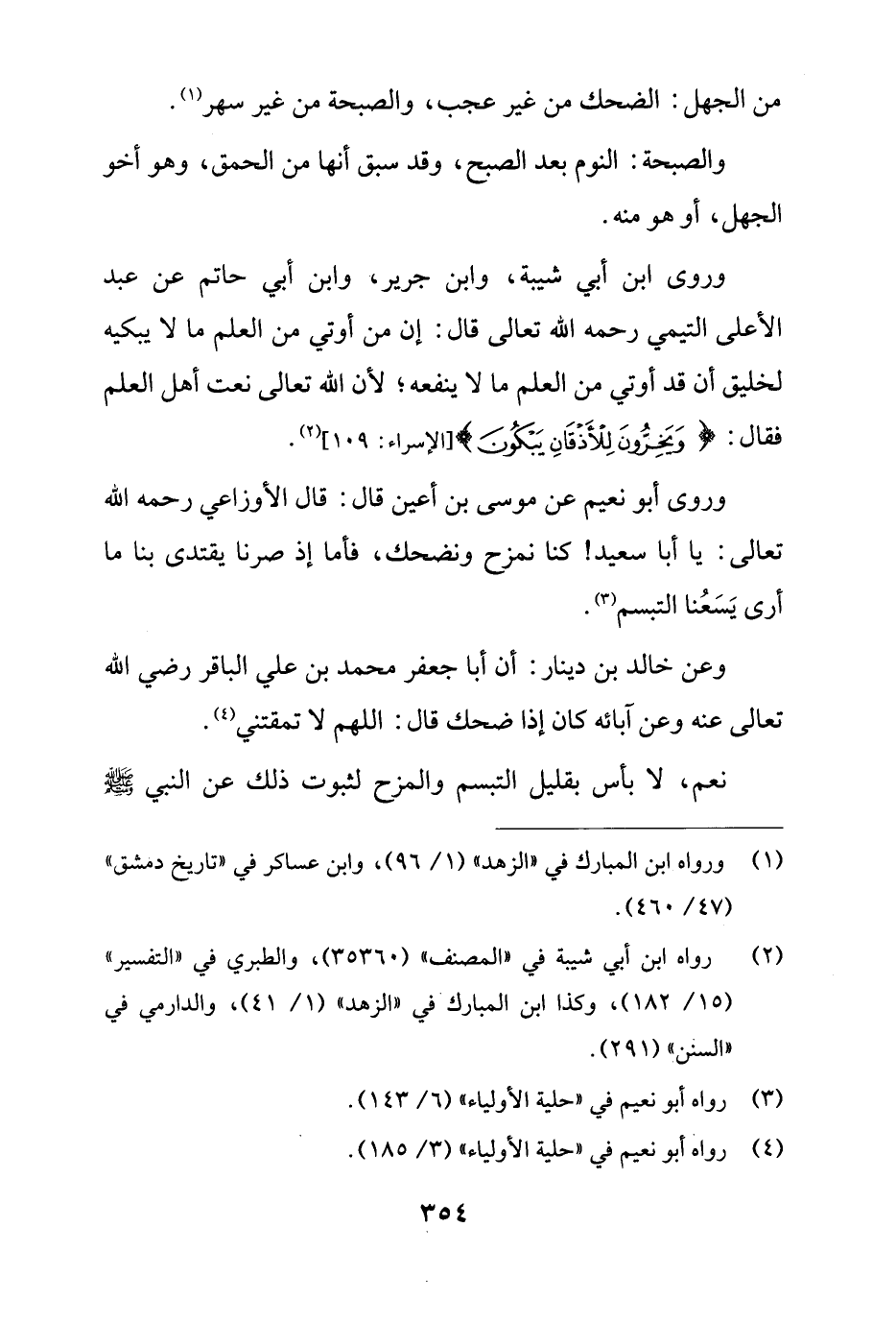 وعن خالد بن دينار: أن أبا جعفر محمد بن علي الباقر رضي الله تعالى عنه وعن آبائه كان إذا ضحك قال: اللهم لا تمقتني (¬4).