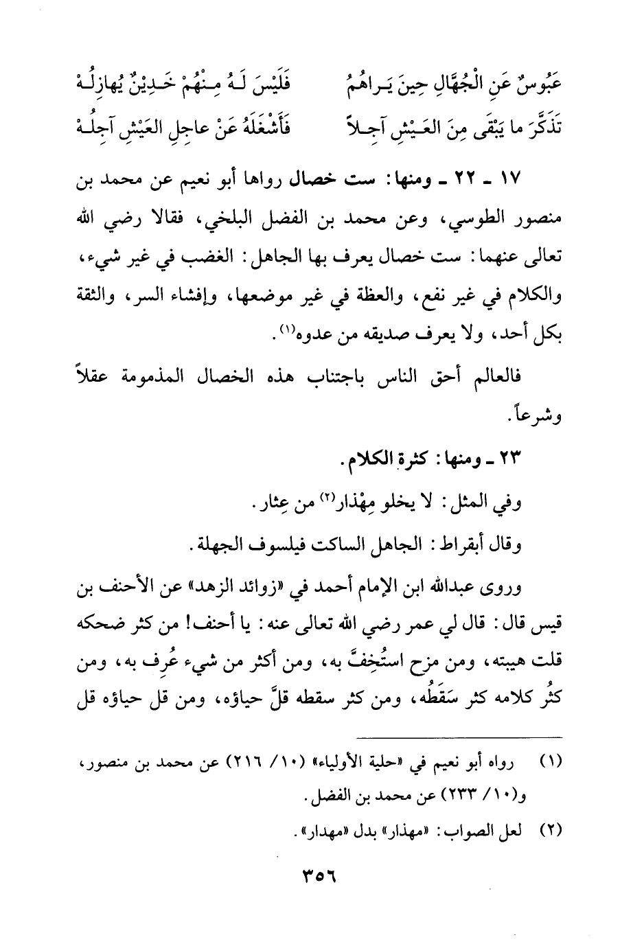 17 - 22 - ومنها: ست خصال رواها أبو نعيم عن محمد بن منصور الطوسي، وعن محمد بن الفضل البلخي، فقالا رضي الله تعالى عنهما: ست خصال يعرف بها الجاهل: الغضب في غير شيء، والكلام في غير نفع، والعظة في غير موضعها، وإفشاء السر، والثقة بكل أحد، ولا يعرف صديقه من عدوه (¬1).