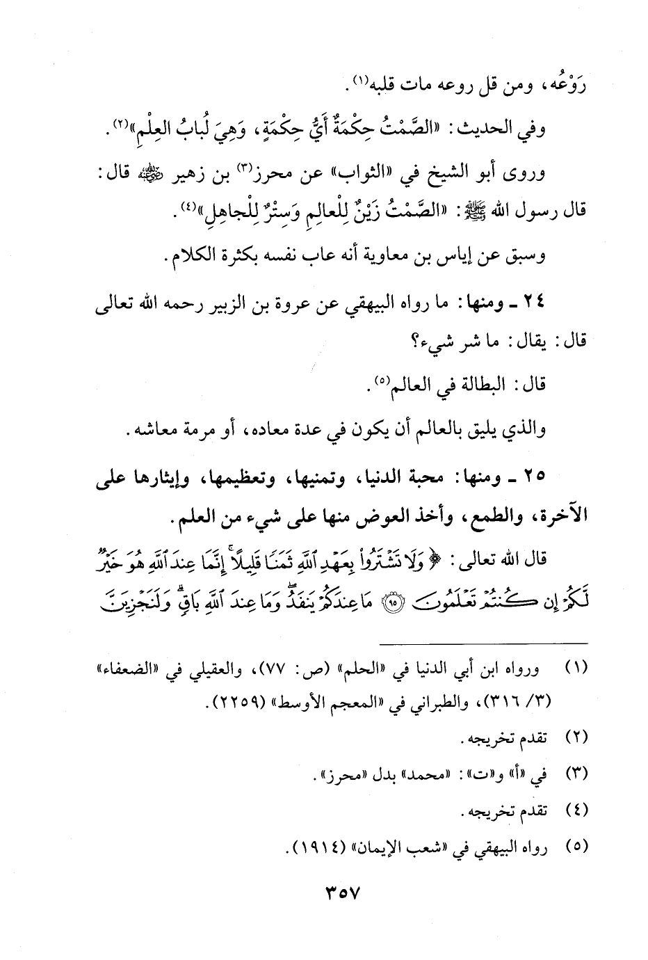 25 - ومنها: محبة الدنيا، وتمنيها، وتعظيمها، وإيثارها على الآخرة، والطمع، وأخذ العوض منها على شيء من العلم.