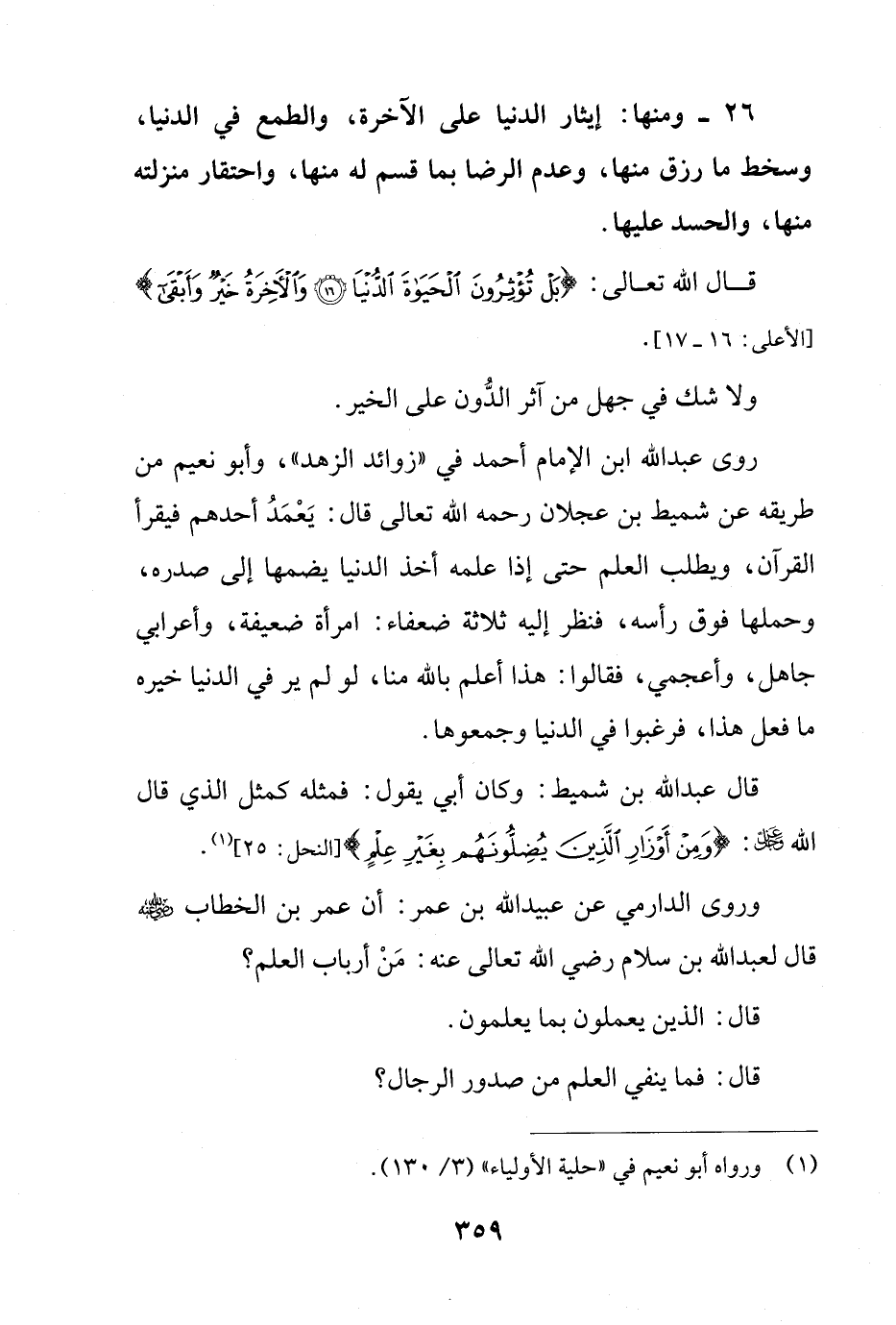 روى عبد الله ابن الإمام أحمد في "زوائد الزهد"، وأبو نعيم من طريقه عن شميط بن عجلان رحمه الله تعالى قال: يَعْمَدُ أحدهم فيقرأ القرآن، ويطلب العلم حتى إذا علمه أخذ الدنيا يضمها إلى صدره، وحملها فوق رأسه، فنظر إليه ثلاثة ضعفاء: امرأة ضعيفة، وأعرابي جاهل، وأعجمي، فقالوا: هذا أعلم بالله منا، لو لم ير في الدنيا خيره ما فعل هذا، فرغبوا في الدنيا وجمعوها.