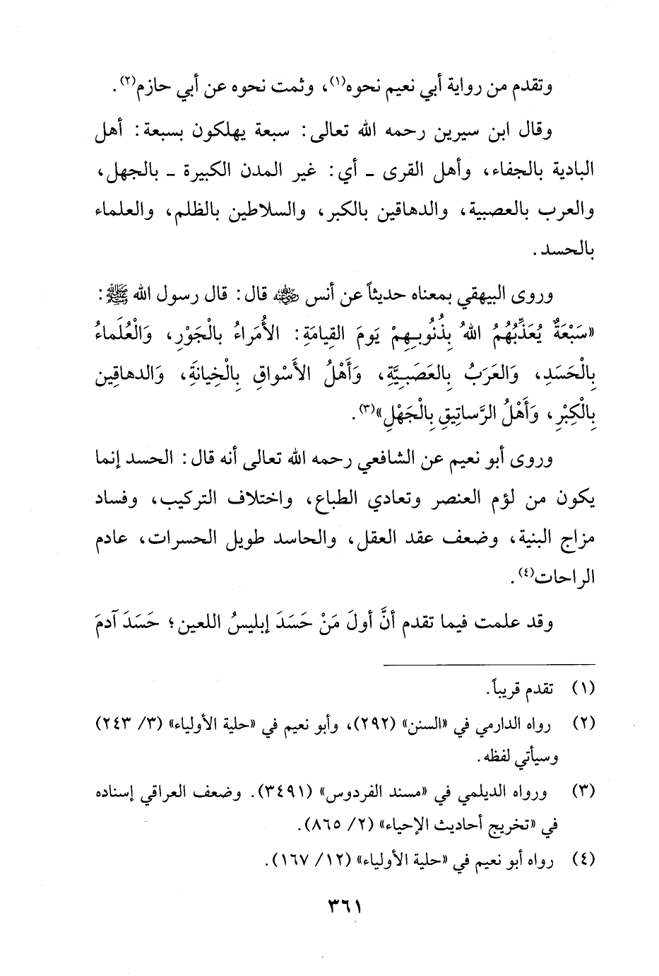 وروى أبو نعيم عن الشافعي رحمه الله تعالى أنه قال: الحسد إنما يكون من لؤم العنصر وتعادي الطباع، واختلاف التركيب، وفساد مزاج البنية، وضعف عقد العقل، والحاسد طويل الحسرات، عادم الراحات (¬4).