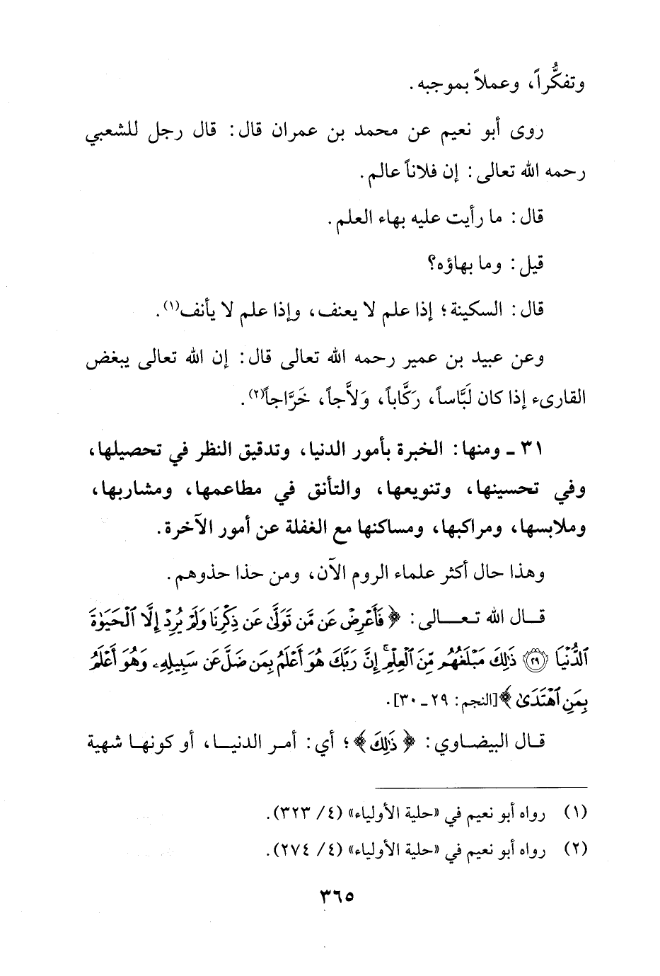 31 - ومنها: الخبرة بأمور الدنيا، وتدقيق النظر في تحصيلها، وفي تحسينها، وتنويعها، والتأنق في مطاعمها، ومشاربها، وملابسها، ومراكبها، ومساكنها مع الغفلة عن أمور الآخرة.