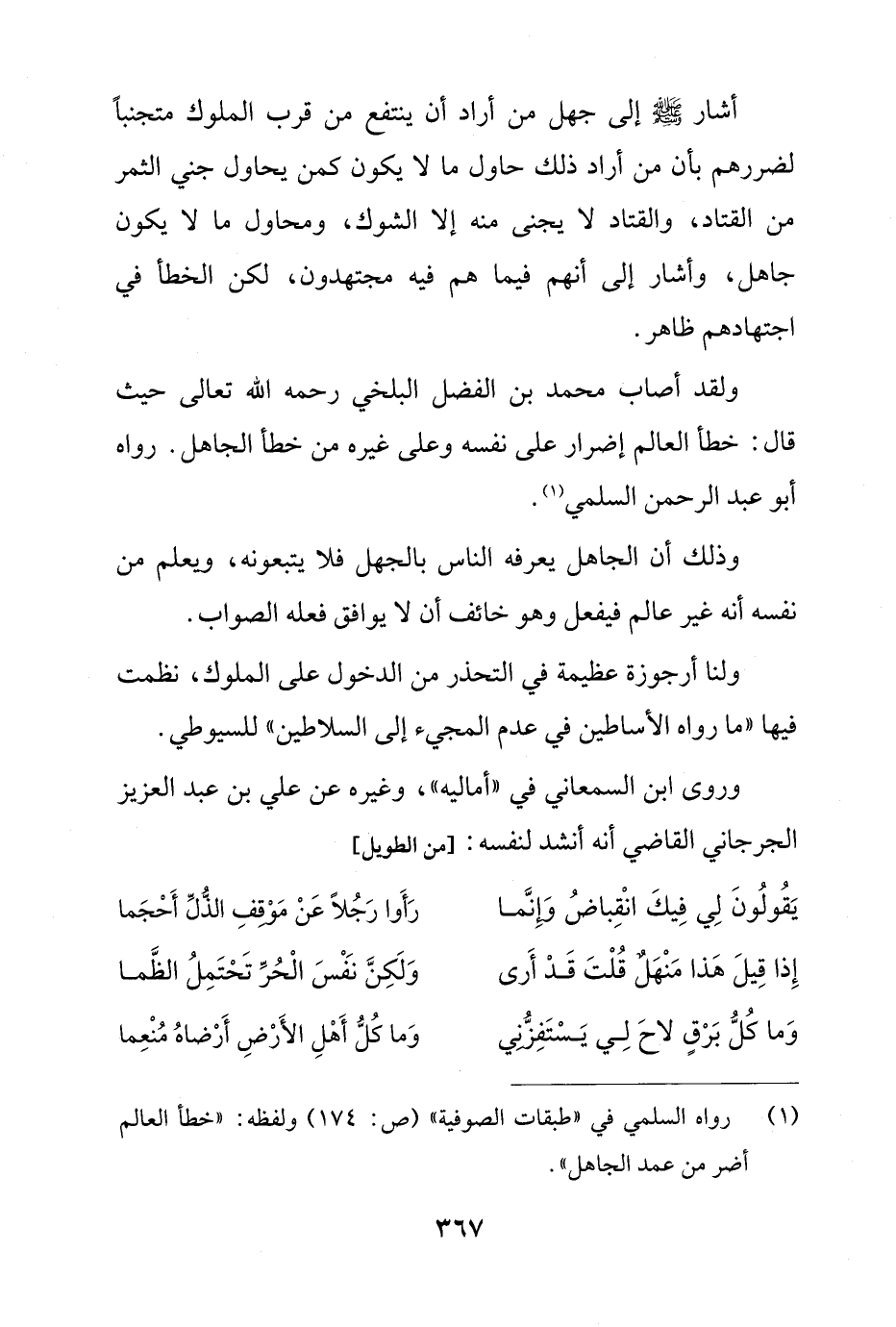 ولقد أصاب محمد بن الفضل البلخي رحمه الله تعالى حيث قال: خطأ العالم إضرار على نفسه وعلى غيره من خطأ الجاهل. رواه أبو عبد الرحمن السلمي (¬1).