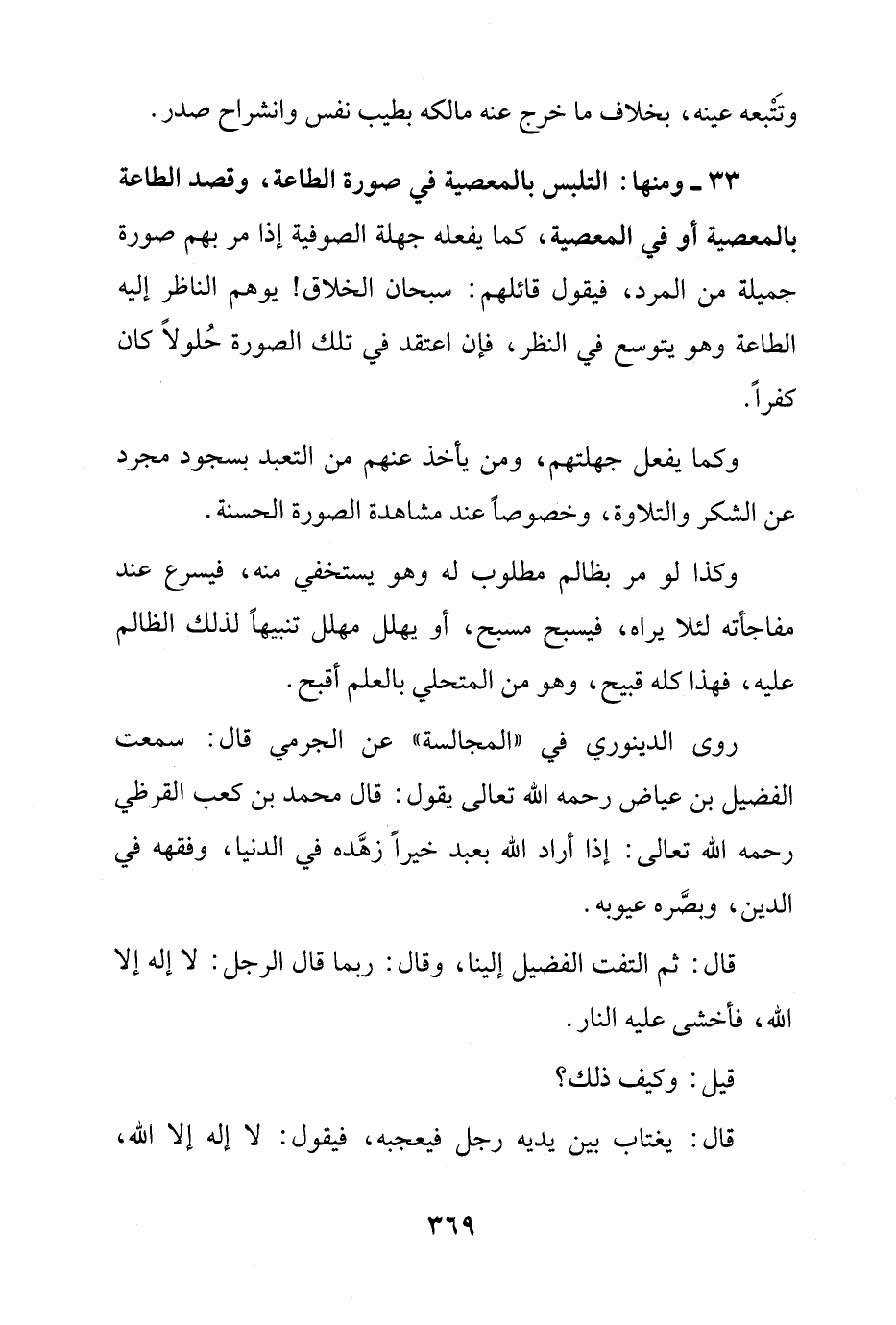 33 - ومنها: التلبس بالمعصية في صورة الطاعة، وقصد الطاعة بالمعصية أو في المعصية، كما يفعله جهلة الصوفية إذا مر بهم صورة جميلة من المرد، فيقول قائلهم: سبحان الخلاق! يوهم الناظر إليه الطاعة وهو يتوسع في النظر، فإن اعتقد في تلك الصورة حُلولاً كان كفراً.