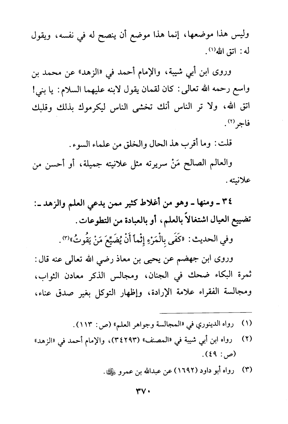 34 - ومنها - وهو من أغلاط كثير ممن يدعي العلم والزهد -: تضييع العيال اشتغالاً بالعلم، أو بالعبادة من التطوعات.