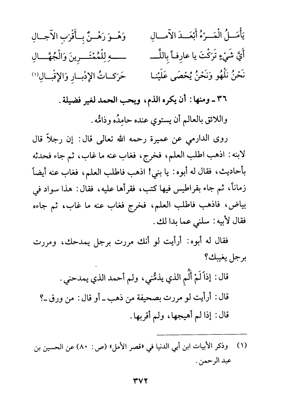 36 - ومنها: أن يكره الذم، ويحب الحمد لغير فضيلة.