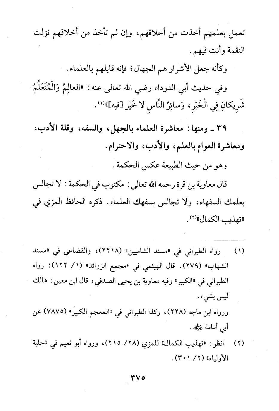 39 - ومنها: معاشرة العلماء بالجهل، والسفه، وقلة الأدب، ومعاشرة العوام بالعلم، والأدب، والاحترام.