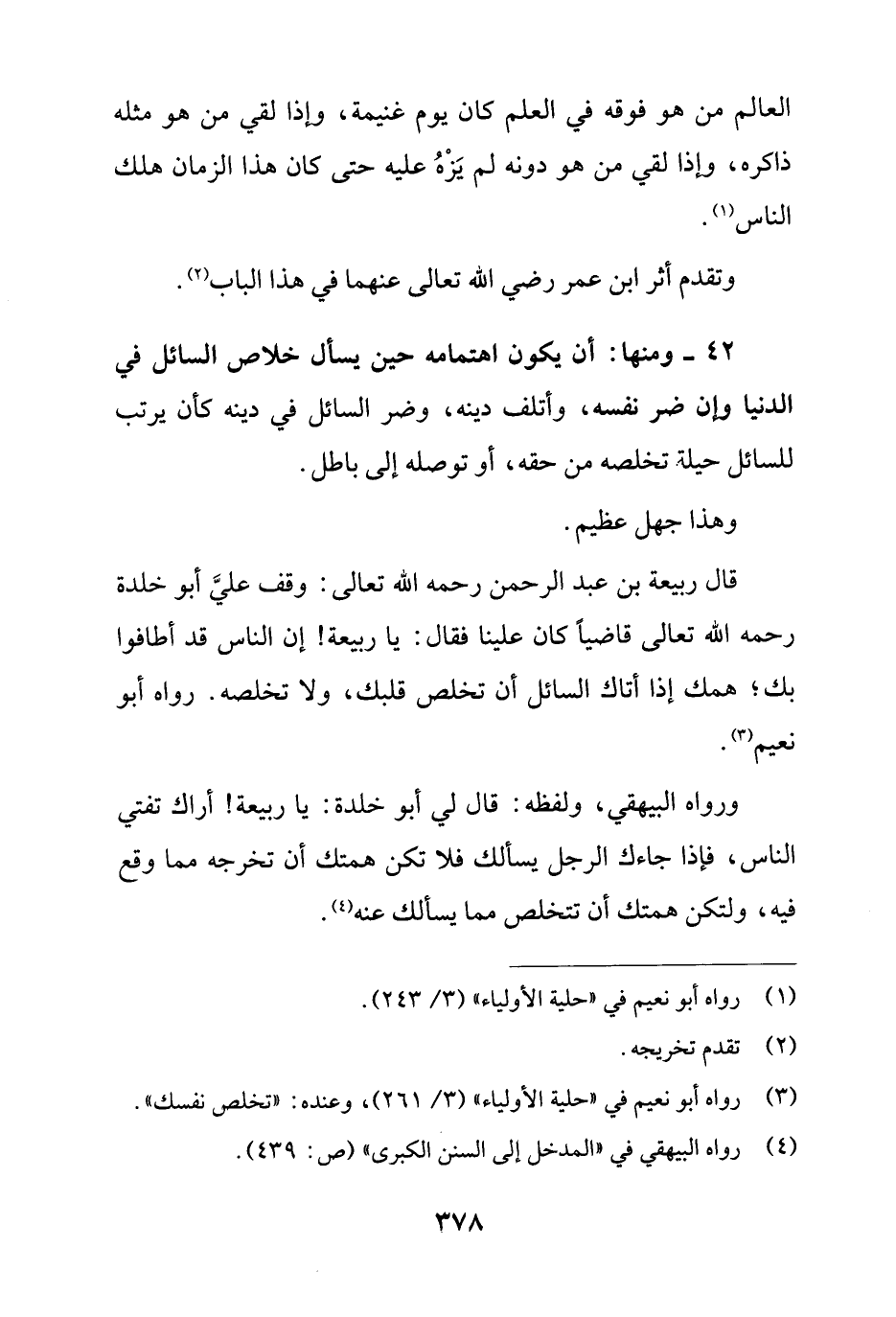ورواه البيهقي، ولفظه: قال لي أبو خلدة: يا ربيعة! أراك تفتي الناس، فإذا جاءك الرجل يسألك فلا تكن همتك أن تخرجه مما وقع فيه، ولتكن همتك أن تتخلص مما يسألك عنه (¬4).
