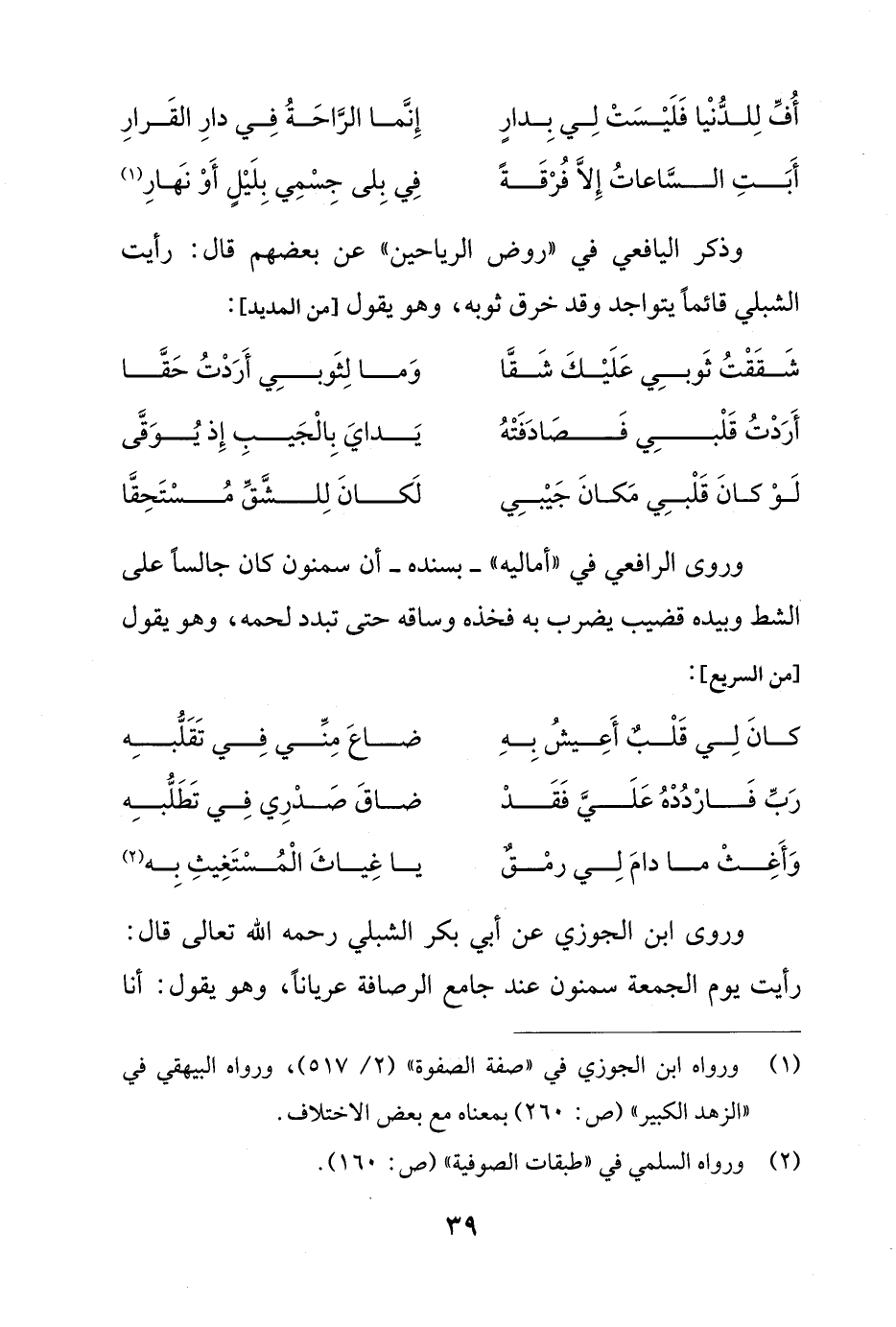 وذكر اليافعي في "روض الرياحين" عن بعضهم قال: رأيت الشبلي قائماً يتواجد وقد خرق ثوبه، وهو يقول [من المديد]:
