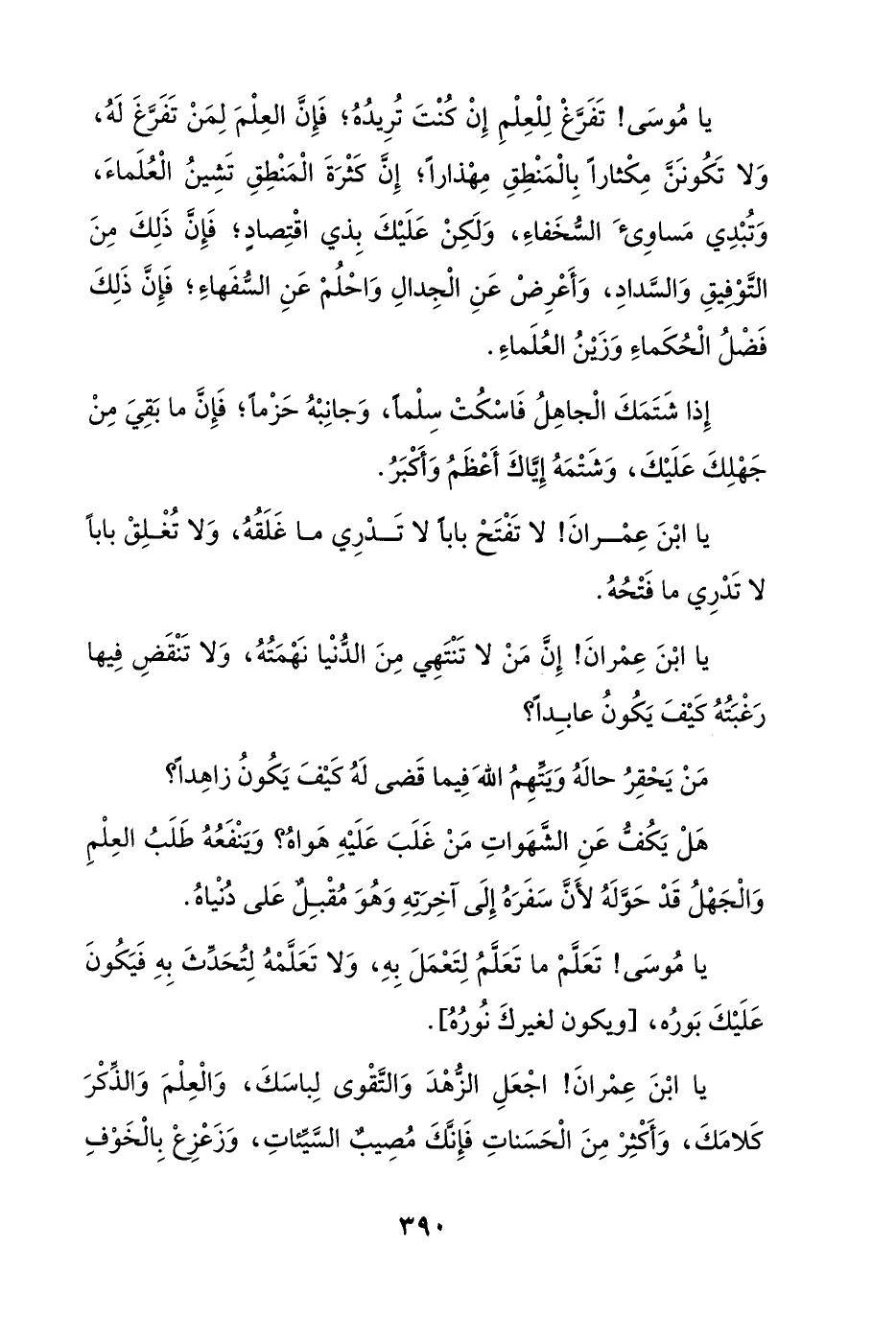 يا مُوسَى! تَفَرَّغْ لِلْعِلْمِ إِنْ كُنْتَ تُرِيدُهُ؛ فَإنَّ العِلْمَ لِمَنْ تَفَرَّغَ لَهُ، وَلا تَكُونَنَّ مِكْثاراً بِالْمَنْطِقِ مِهْذاراً؛ إِنَّ كَثْرَةَ الْمَنْطِقِ تَشِينُ الْعُلَماءَ، وَتُبْدِي مَساوِئَ السُّخَفاءِ، وَلَكِنْ عَلَيْكَ بِذي اقْتِصادٍ؛ فَإِنَّ ذَلِكَ مِنَ التَّوفِيقِ وَالسَّدادِ، وَأَعْرِضْ عَنِ الْجِدالِ وَاحْلُمْ عَنِ السُّفَهاءِ؛ فَإِنَّ ذَلِكَ فَضْلُ الْحُكَماءِ وَزينُ العُلَماءِ.