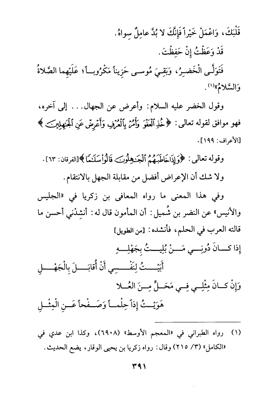 وفي هذا المعنى ما رواه المعافى بن زكريا في "الجليس والأنيس" عن النضر بن شُميل: أن المأمون قال له: أنشِدْني أحسن ما قالته العرب في الحلم، فأنشده: [من الطويل]