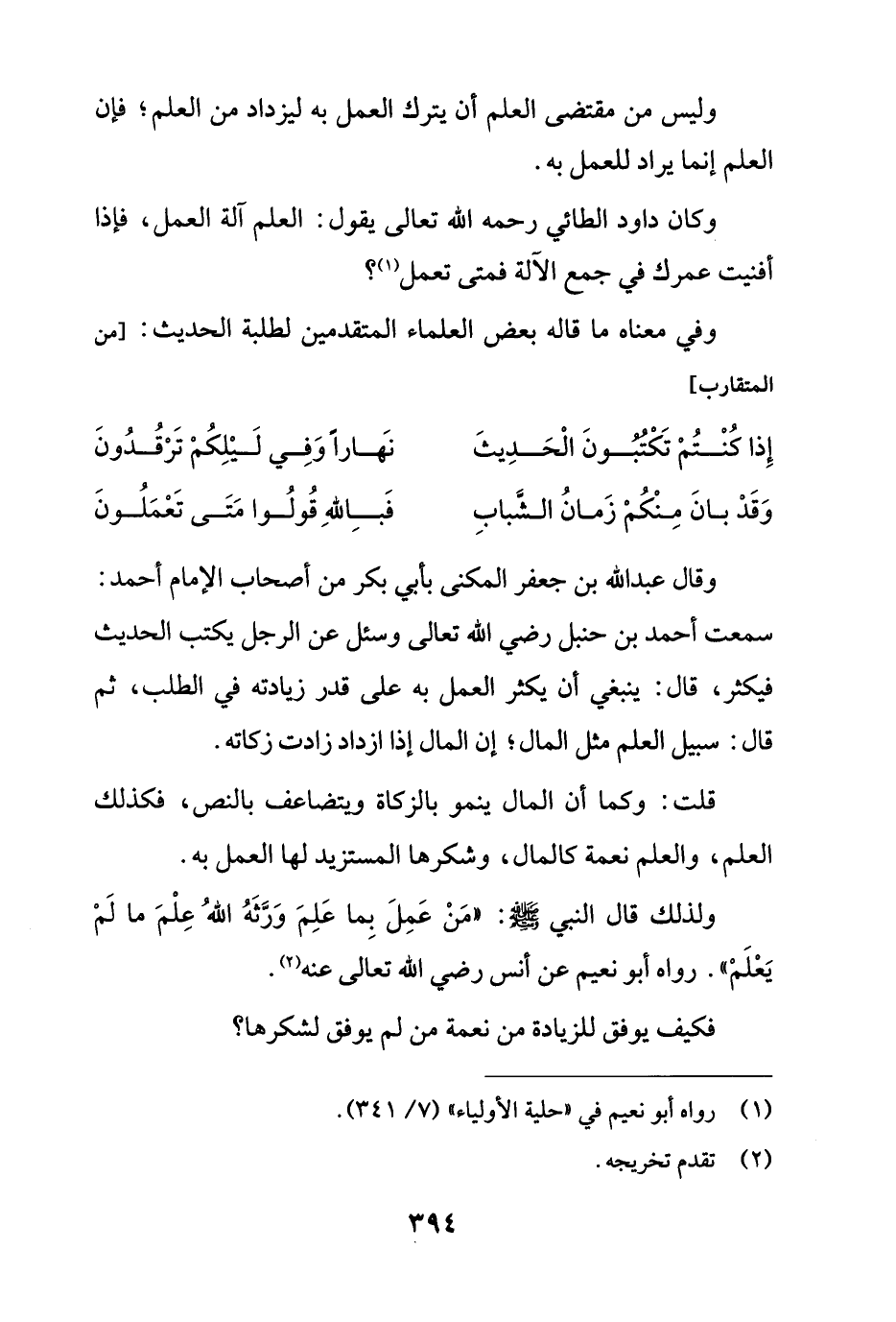 ولذلك قال النبي - صلى الله عليه وسلم -: "مَنْ عَمِلَ بِما عَلِمَ وَرَّثَهُ اللهُ عِلْمَ ما لَمْ يَعْلَمْ". رواه أبو نعيم عن أنس رضي الله تعالى عنه (¬2).