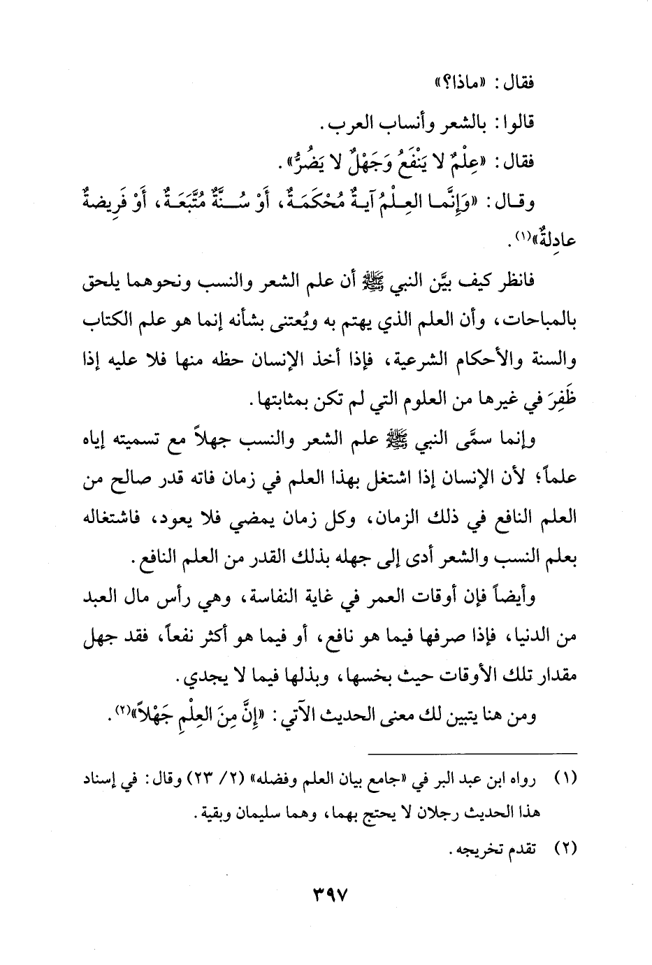 وإنما سمَّى النبي - صلى الله عليه وسلم - علم الشعر والنسب جهلًا مَع تسميته إياه علماً؛ لأن الإنسان إذا اشتغل بهذا العلم في زمان فاته قدر صالح من العلم النافع في ذلك الزمان، وكل زمان يمضي فلا يعود، فاشتغاله بعلم النسب والشعر أدى إلى جهله بذلك القدر من العلم النافع.