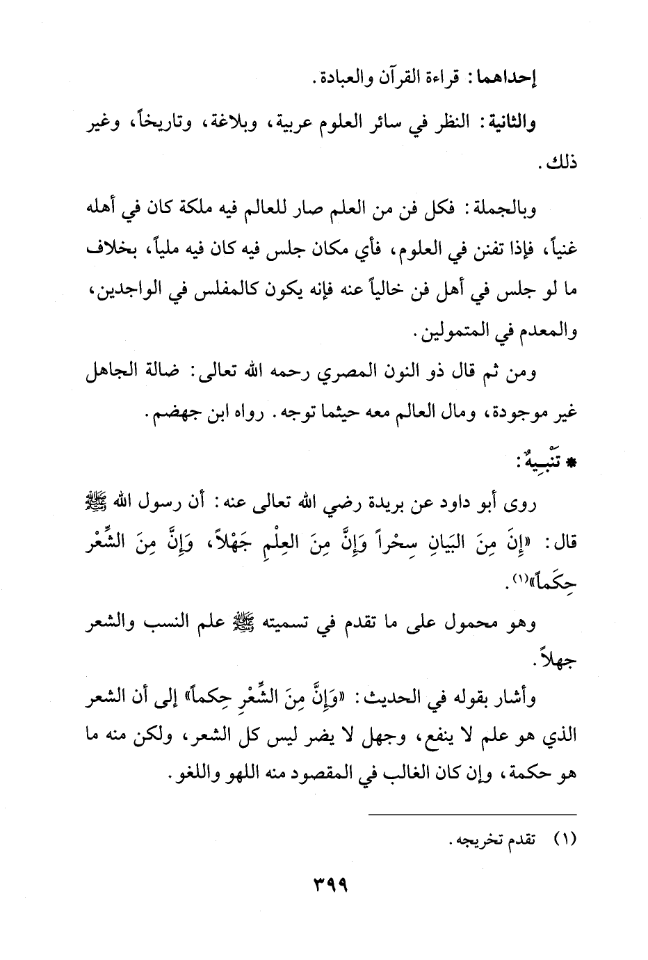 وأشار بقوله في الحديث: "وَإِنَّ مِنَ الشِّعْرِ حِكماً" إلى أن الشعر الذي هو علم لا ينفع، وجهل لا يضر ليس كل الشعر، ولكن منه ما هو حكمة، وإن كان الغالب في المقصود منه اللهو واللغو.