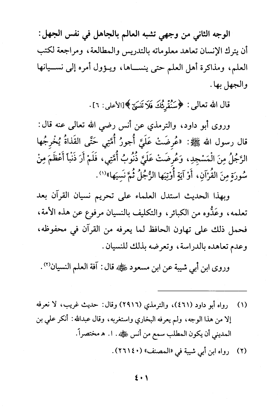 وروى أبو داود، والترمذي عن أنس رضي الله تعالى عنه قال: قال رسول الله - صلى الله عليه وسلم -: "عُرِضَتْ عَلَيَّ أُجورُ أُمَّتِي حَتَّى القَذاةُ يُخْرِجُها الرَّجُلُ مِنَ الْمَسْجِدِ، وَعُرِضَتْ عَلَيَّ ذُنُوبُ أُمَّتِي، فَلَمْ أَرَ ذَنْباً أَعْظَمَ مِنْ سُورَةٍ مِنَ القُرْآنِ، أَوْ آيَةٍ أُوْتِيَها الرُّجُلُ ثُمَّ نسِيَها" (¬1).