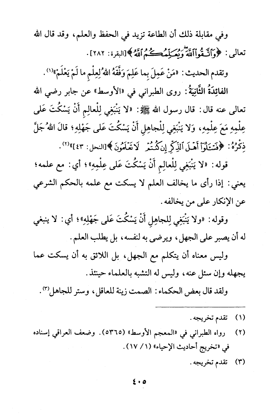 الفائِدَةُ الثَّانِيَةُ: روى الطبراني في "الأوسط" عن جابر رضي الله تعالى عنه قال: قال رسول الله - صلى الله عليه وسلم -: "لا يَنْبَغِي لِلْعالِمِ أَنْ يَسْكُتَ عَلى عِلْمِهِ مَعَ عِلْمِهِ، وَلا يَنْبَغِي لِلْجاهِلِ أَنْ يَسْكُتَ عَلى جَهْلِهِ؛ قالَ اللهُ جَلَّ ذِكْرُهُ: {فَاسْأَلُوا أَهْلَ الذِّكْرِ إِنْ كُنْتُمْ لَا تَعْلَمُونَ} [النحل: 43] " (¬2).