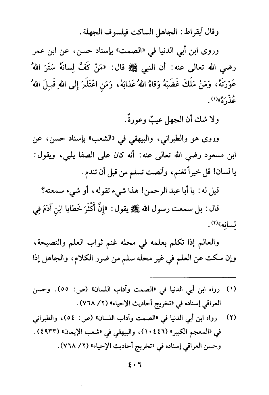 (¬2) رواه ابن أبي الدنيا في "الصمت وآداب اللسان" (ص: 54)، والطبراني في "المعجم الكبير" (10446)، والبيهقي في "شعب الإيمان" (4933). وحسن العراقي إسناده في "تخريج أحاديث الإحياء" (2/ 768).