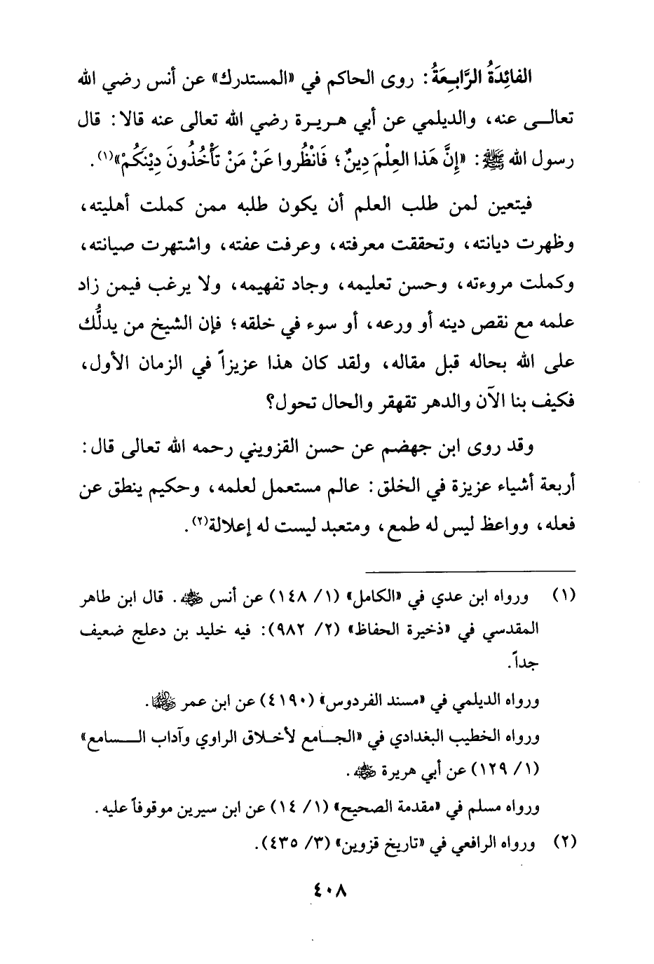 الفائِدَةُ الرَّابِعَةُ: روى الحاكم في "المستدرك" عن أنس رضي الله تعالى عنه، والديلمي عن أبي هريرة رضي الله تعالى عنه قالا: قال رسول الله - صلى الله عليه وسلم -: "إِنَّ هَذا العِلْمَ دِينٌ؛ فَانْظُروا عَنْ مَنْ تأْخذُونَ دِيْنَكُم" (¬1).