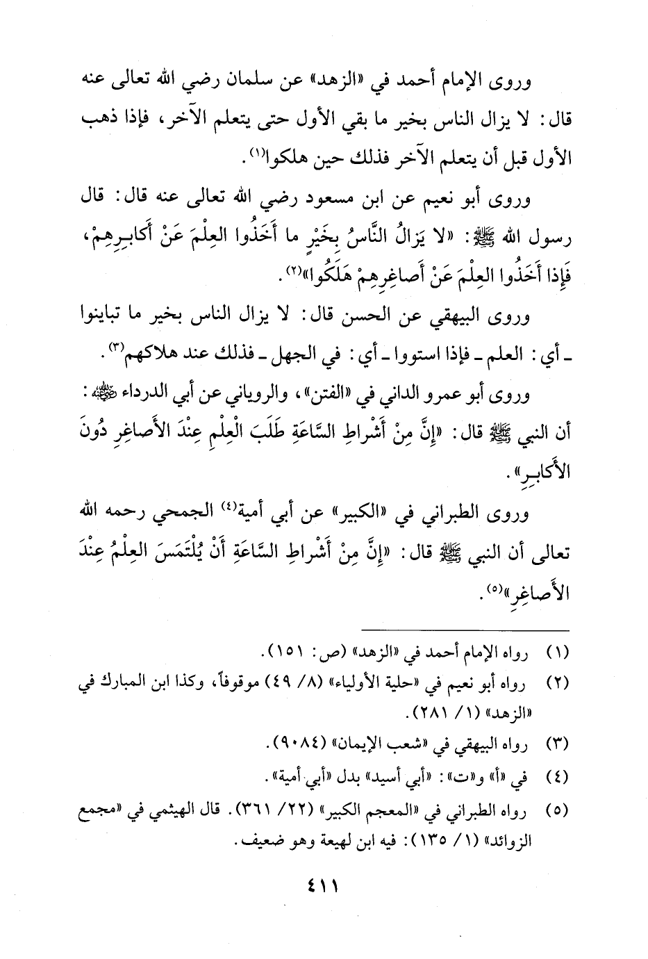 وروى الإمام أحمد في "الزهد" عن سلمان رضي الله تعالى عنه قال: لا يزال الناس بخير ما بقي الأول حتى يتعلم الآخر، فإذا ذهب الأول قبل أن يتعلم الآخر فذلك حين هلكوا (¬1).