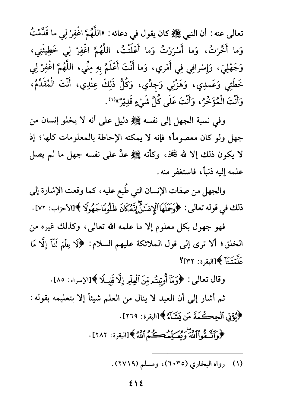 وفي نسبة الجهل إلى نفسه - صلى الله عليه وسلم - دليل على أنه لا يخلو إنسان من جهل ولو كان معصوماً؛ فإنه لا يمكنه الإحاطة بالمعلومات كلها؛ إذ لا يكون ذلك إلا لله - عز وجل -، وكأنه - صلى الله عليه وسلم - عدَّ على نفسه جهل ما لم يصل علمه إليه ذنباً، فاستغفر منه.