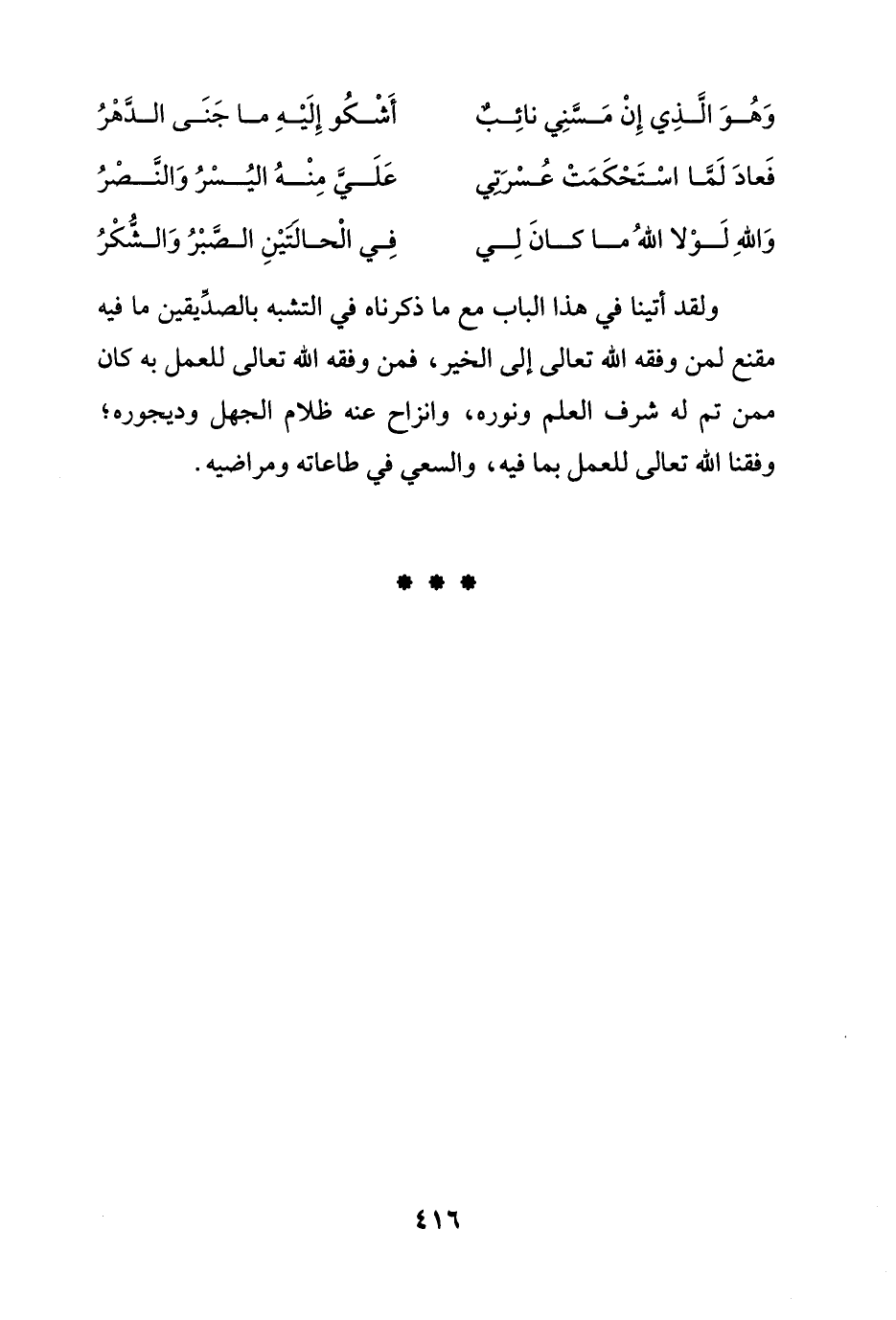 ولقد أتينا في هذا الباب مع ما ذكرناه في التشبه بالصدِّيقين ما فيه مقنع لمن وفقه الله تعالى إلى الخير، فمن وفقه الله تعالى للعمل به كان ممن تم له شرف العلم ونوره، وانزاح عنه ظلام الجهل وديجوره؛ وفقنا الله تعالى للعمل بما فيه، والسعي في طاعاته ومراضيه.