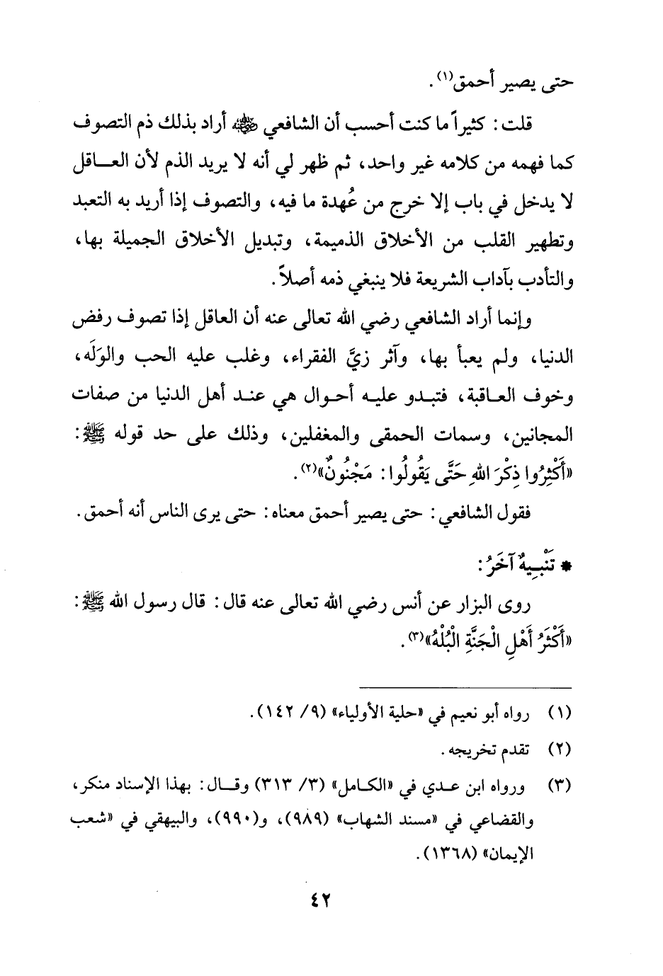 قلت: كثيراً ما كنت أحسب أن الشافعي - رضي الله عنه - أراد بذلك ذم التصوف كما فهمه من كلامه غير واحد، ثم ظهر لي أنه لا يريد الذم لأن العاقل لا يدخل في باب إلا خرج من عُهدة ما فيه، والتصوف إذا أريد به التعبد وتطهير القلب من الأخلاق الذميمة، وتبديل الأخلاق الجميلة بها، والتأدب بآداب الشريعة فلا ينبغي ذمه أصلاً.