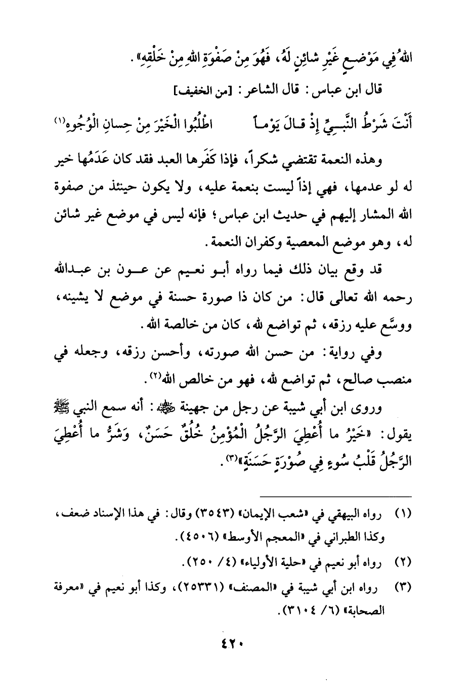 وهذه النعمة تقتضي شكراً، فإذا كَفَرها العبد فقد كان عَدَمُها خير له لو عدمها، فهي إذاً ليست بنعمة عليه، ولا يكون حينئذ من صفوة الله المشار إليهم في حديث ابن عباس؛ فإنه ليس في موضع غير شائن له، وهو موضع المعصية وكفران النعمة.