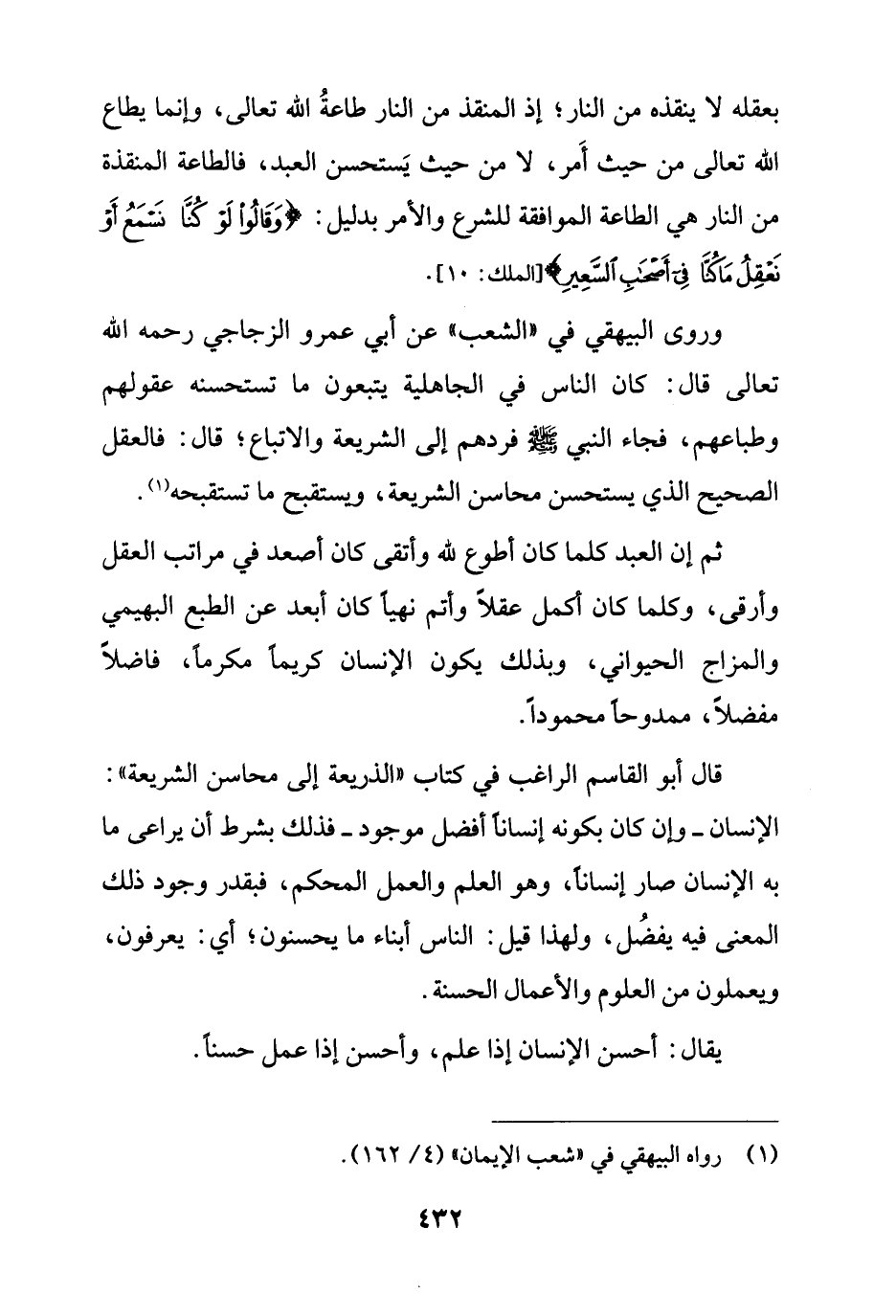 قال أبو القاسم الراغب في كتاب "الذريعة إلى محاسن الشريعة": الإنسان - وإن كان بكونه إنساناً أفضل موجود - فذلك بشرط أن يراعى ما به الإنسان صار إنساناً، وهو العلم والعمل المحكم، فبقدر وجود ذلك المعنى فيه يفضُل، ولهذا قيل: الناس أبناء ما يحسنون؛ أي: يعرفون، ويعملون من العلوم والأعمال الحسنة.