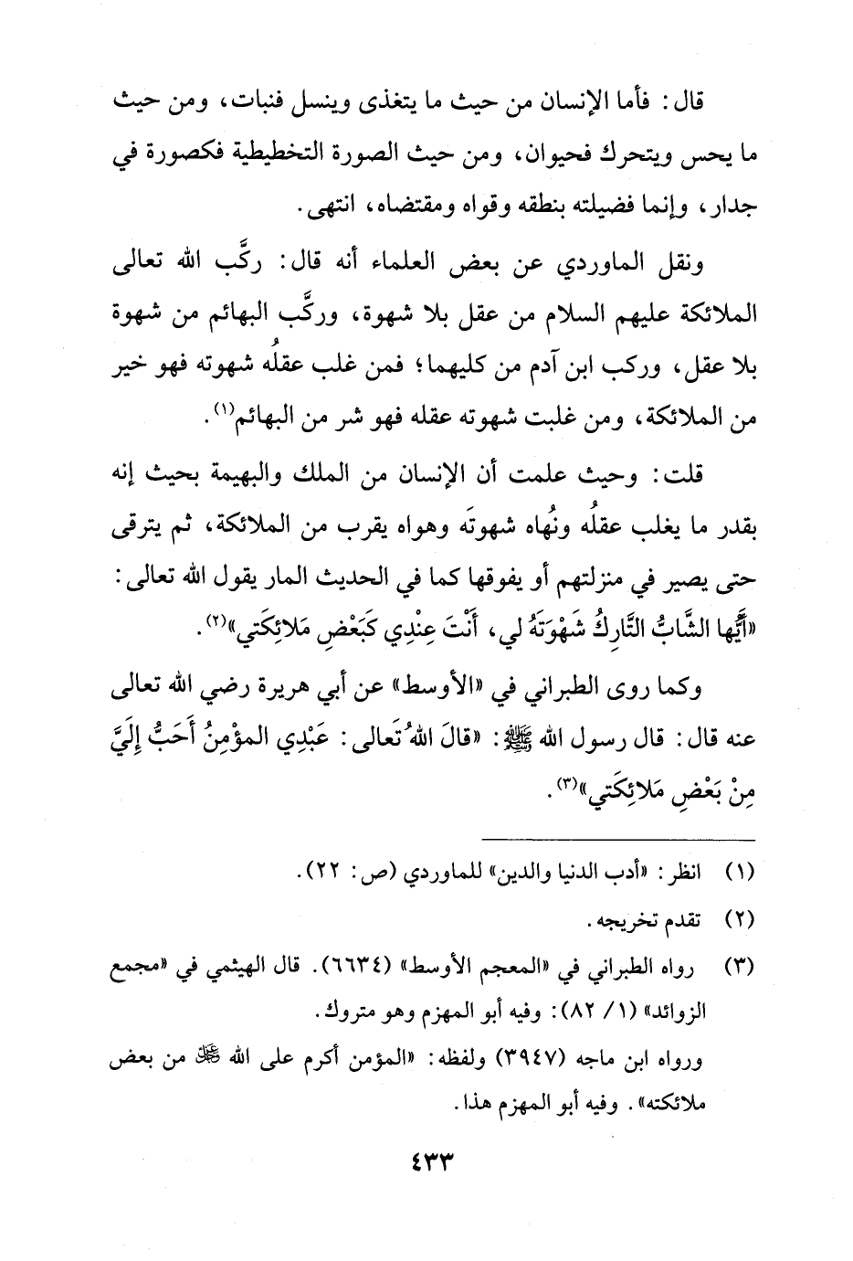 ونقل الماوردي عن بعض العلماء أنه قال: ركَّب الله تعالى الملائكة عليهم السلام من عقل بلا شهوة، وركَّب البهائم من شهوة بلا عقل، وركب ابن آدم من كليهما؛ فمن غلب عقلُه شهوته فهو خير من الملائكة، ومن غلبت شهوته عقله فهو شر من البهائم (¬1).