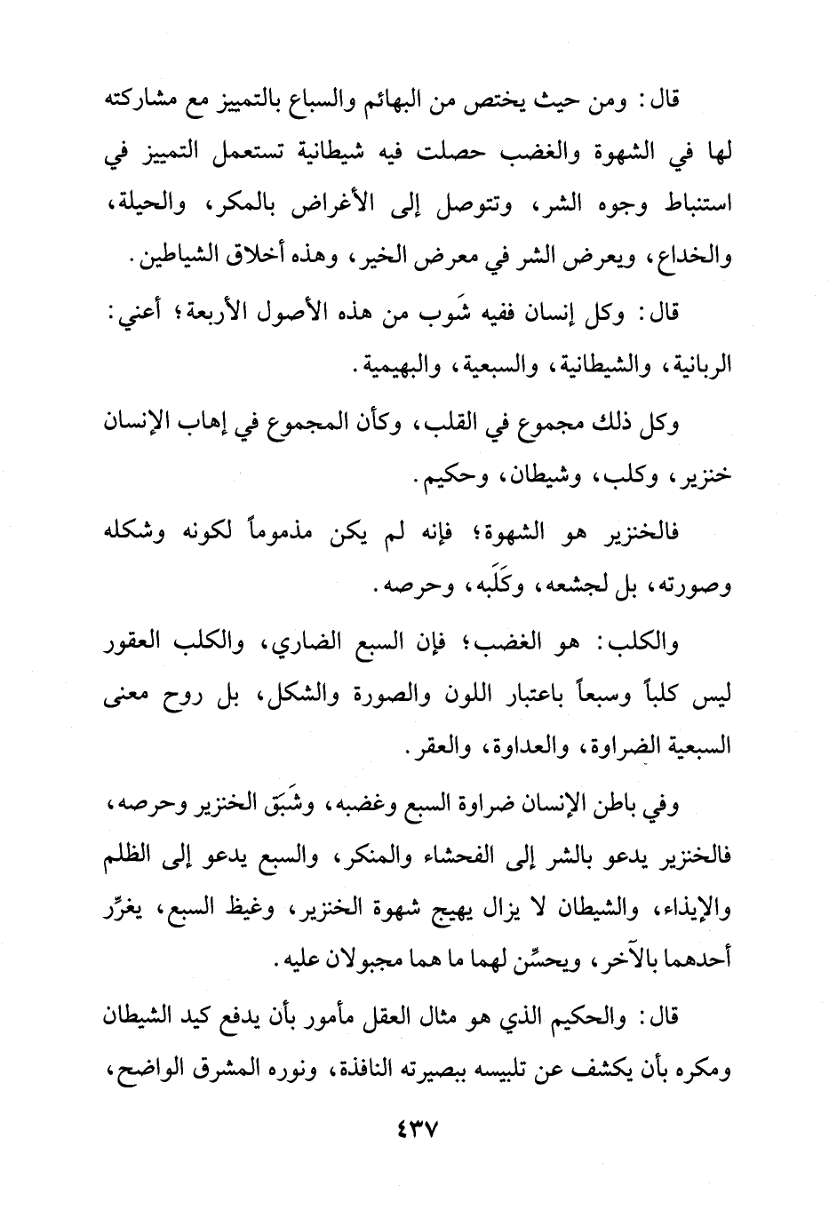 قال: وكل إنسان ففيه شَوب من هذه الأصول الأربعة؛ أعني: الربانية، والشيطانية، والسبعية، والبهيمية.