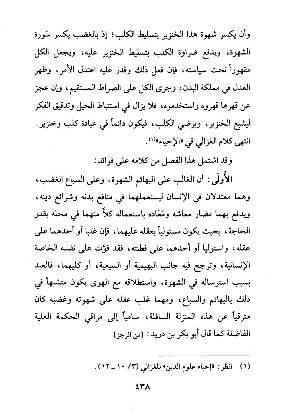 الأُولَى: أن الغالب على البهائم الشهوة، وعلى السباع الغضب، وهما معتدلان في الإنسان ليستعملهما في منافع بدنه وشرائع دينه، ويدفع بهما مضار معاشه ومَعَاده باستعماله كلًّا منهما في محله بقدر الحاجة، بحيث يكون مستولياً بعقله عليهما، فإن غلبا أو أحدهما على عقله، واستوليا أو أحدهما على فطنته، فقد فوَّت على نفسه الخاصة الإنسانية، وترجح فيه جانب البهيمية أو السبعية، أو كليهما، فالعبد بسبب استرساله في الشهوة، واستطلاقه مع الهوى يكون متشبهاً في ذلك بالبهائم والسباع، ومهما غلب عقله على شهوته وغضبه كان مترقياً عن هذه المنزلة السافلة، سامياً إلى مراقي الحكمة العلية الفاضلة كما قال أبو بكر بن دريد: [من الرجز]
