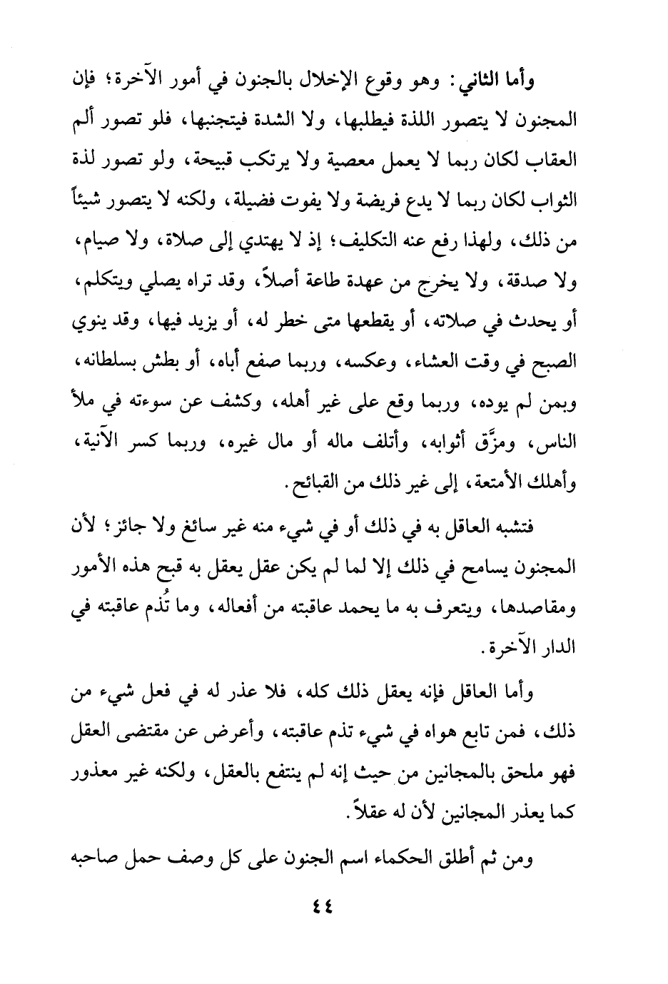 وأما الثاني: وهو وقوع الإخلال بالجنون في أمور الآخرة؛ فإن المجنون لا يتصور اللذة فيطلبها، ولا الشدة فيتجنبها، فلو تصور ألم العقاب لكان ربما لا يعمل معصية ولا يرتكب قبيحة، ولو تصور لذة الثواب لكان ربما لا يدع فريضة ولا يفوت فضيلة، ولكنه لا يتصور شيئاً من ذلك، ولهذا رفع عنه التكليف؛ إذ لا يهتدي إلى صلاة، ولا صيام، ولا صدقة، ولا يخرج من عهدة طاعة أصلاً، وقد تراه يصلي ويتكلم، أو يحدث في صلاته، أو يقطعها متى خطر له، أو يزيد فيها، وقد ينوي الصبح في وقت العشاء، وعكسه، وربما صفع أباه، أو بطش بسلطانه، وبمن لم يوده، وربما وقع على غير أهله، وكشف عن سوءته في ملأ الناس، ومزَّق أثوابه، وأتلف ماله أو مال غيره، وربما كسر الآنية، وأهلك الأمتعة، إلى غير ذلك من القبائح.