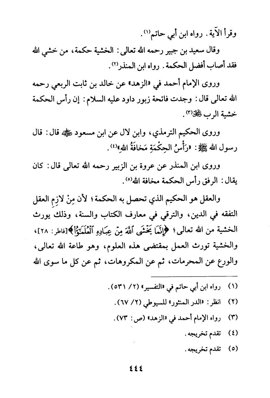 وروى الإمام أحمد في "الزهد" عن خالد بن ثابت الربعي رحمه الله تعالى قال: وجدت فاتحة زبور داود عليه السلام: إن رأس الحكمة خشية الرب - عز وجل - (¬3).